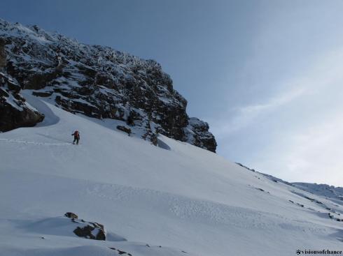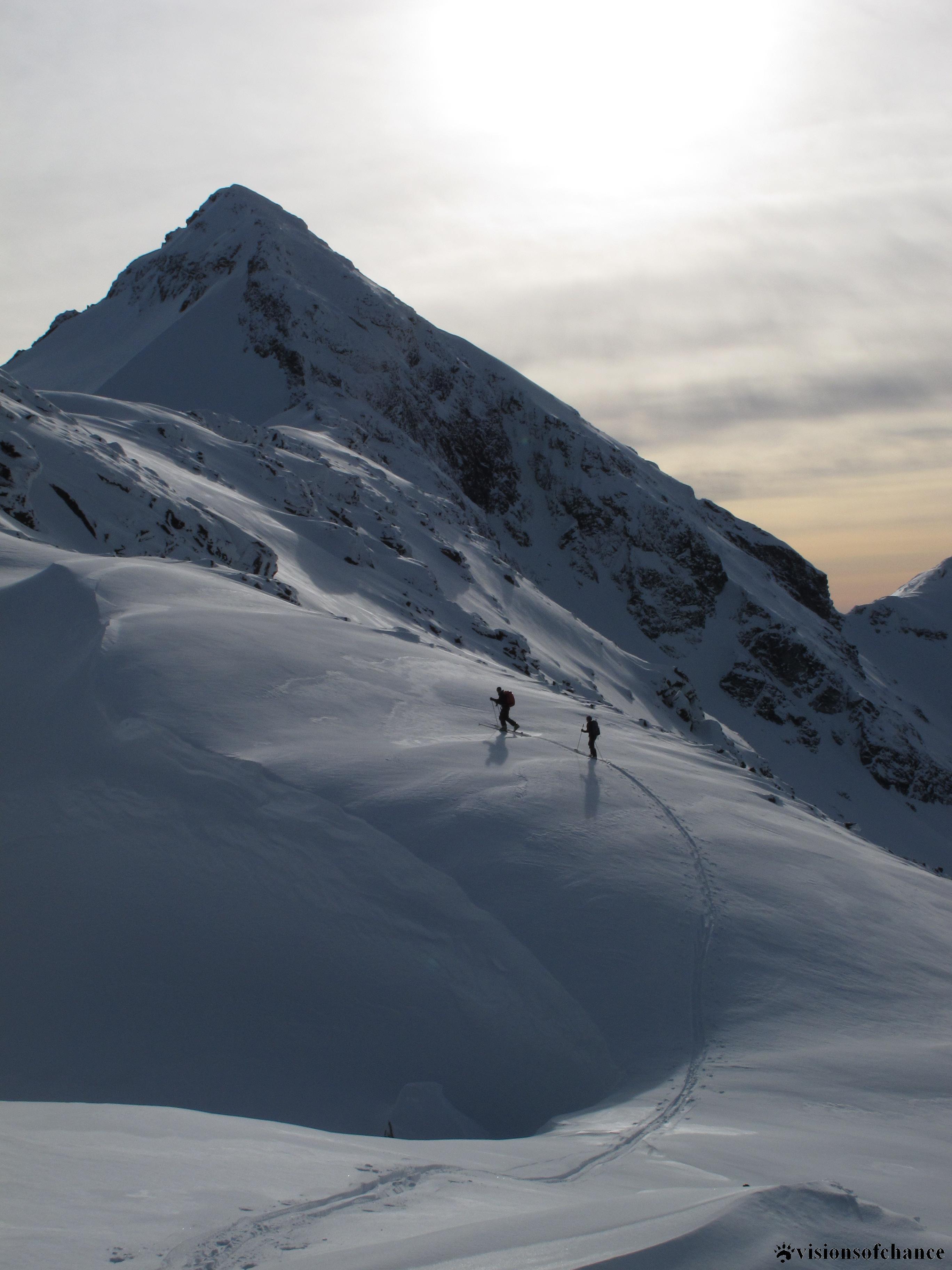 In the beginning of January I finally bagged the summit of Mt English. One of my first days of skiing in the Monashees was in the Mt English zone, one of Revelstoke’s prime, close proximity touring spots, easy access if you have a snowmobile. I don’t, so I didn’t hesitate for a second when Joey offered to tow Danyelle, Greg and myself up to the”cabin”. Having tweaked his ankle a day or two before, Joey wasn’t even clicking into his splitboard to join us, just ferrying us up! What a guy. This peak has been on my list since that first visit many years ago, and it was a great day of touring. Here a couple pics.