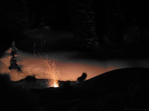 - Creekside camp. A nice blazing fire, thanks to a snowsaw that is also capable of sawing through wood.