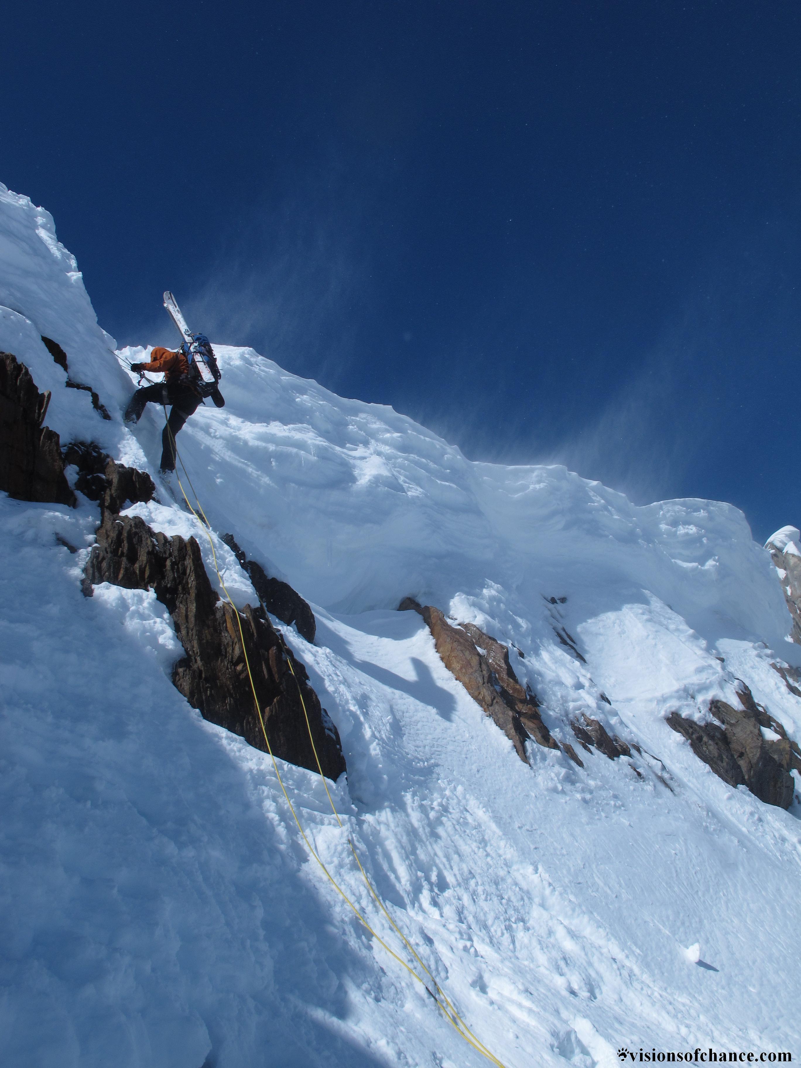Half an hour of skinning put us back on top of the rock step, and we rigged a rappel to get back down it and headed back to our cache.