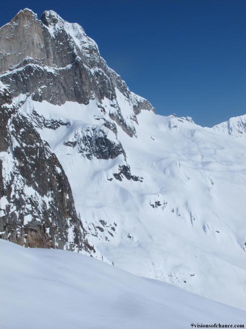 The first climb of the day went pretty slick, and cresting into the sun on the ridge brought astounding vistas and a welcome bit of warmth. Looking down a potentially unskied 3500′ NE facing glaciated run with cold pow on it had us feeling pretty good too. After a quick look across the valley at the first half of our main objective climb: