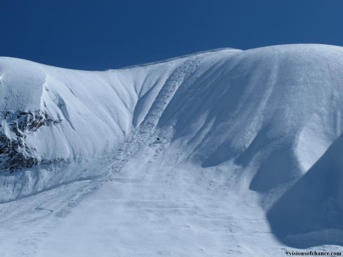 We chose a different option for gaining the ridge, but when we did (via a small rock step through the cornices) we were back on their uptrack. To the summit!