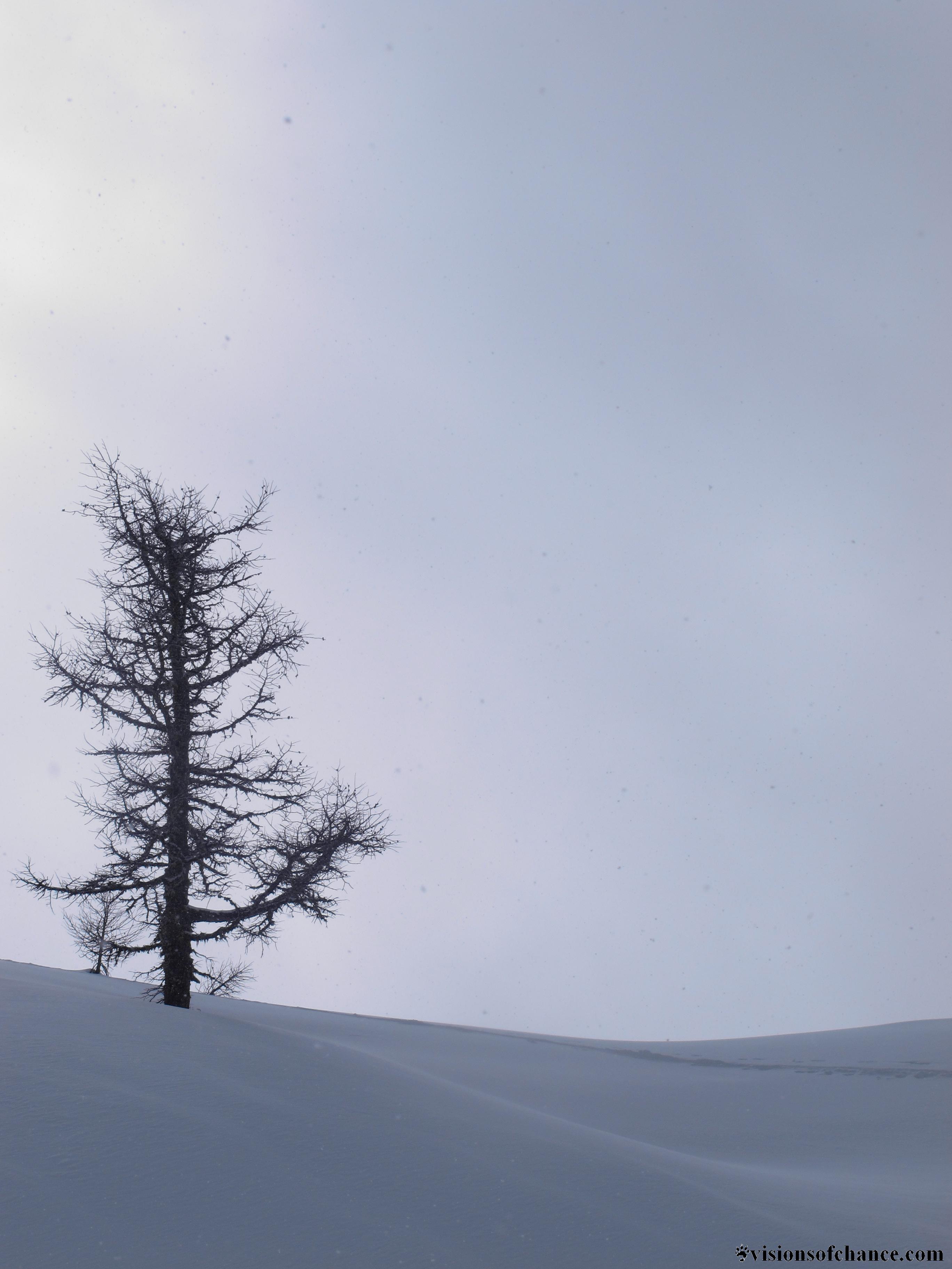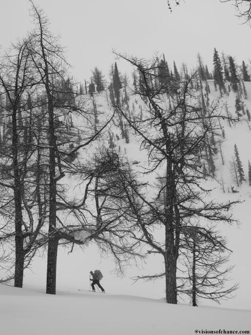 Another evening in the same camp afforded a setting-sun-drenched view of the above turns, and light packs the next morning for the exit. A climb straight out of camp led us through scenic larches to a low pass.