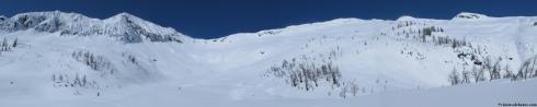 After the high fives and exulted talk of the epicness we had just experienced, the packs were exploded and we skinned away from our cache with high spirits and much lighter loads. We almost immediately came across faint signs of the other teams passage, also headed for the summit today. We had sweet views of our run, if you enlarge you can see our tracks.