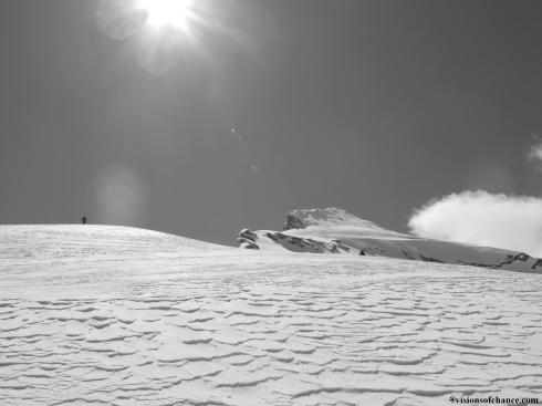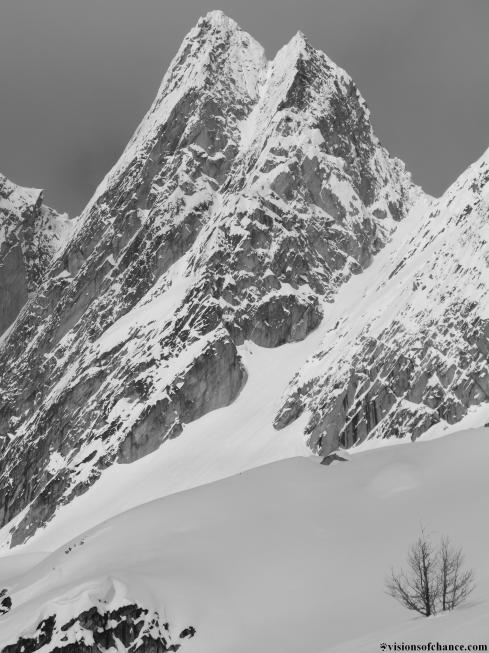 We gained elevation, every lift of the weary head filling my eyes with three hundred sixty degree views of exciting skiing. What can be better than travelling into new terrain with the feeling that we are incredibly lucky to live in a region full of lifetimes of mountainous wilderness landscape. Crossing over a steep ridge, we traversed a SW facing bowl with a few great turns mixed in, and headed for the rib that would take us to Camp 2.