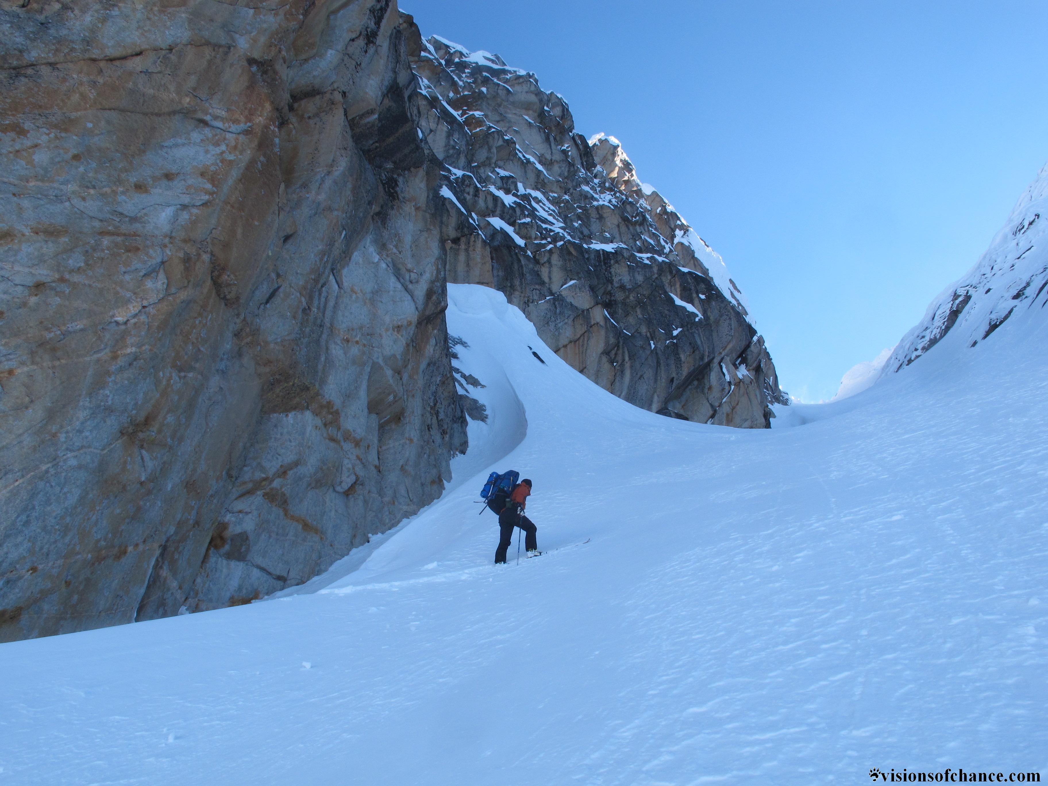 The megamid was pitched near the base of the couloir pictured above , which was to be our access to the other side. From there, weather and conditions permitting, we can try for the jagged granite summit. Our hopes were high as we watched the sky fade through the alpenglow palette, bellies full, legs tired, but ready for another day of exploring.