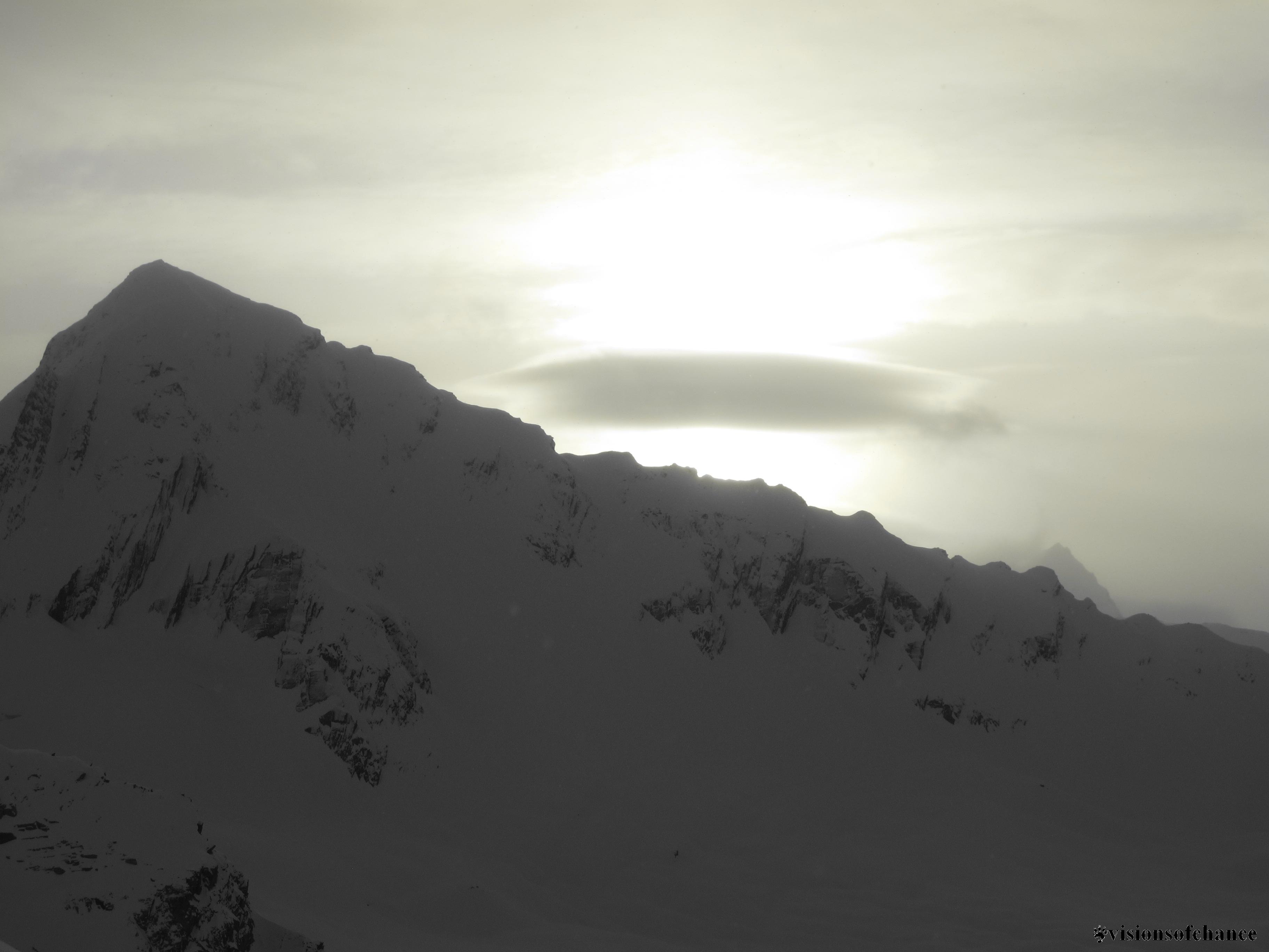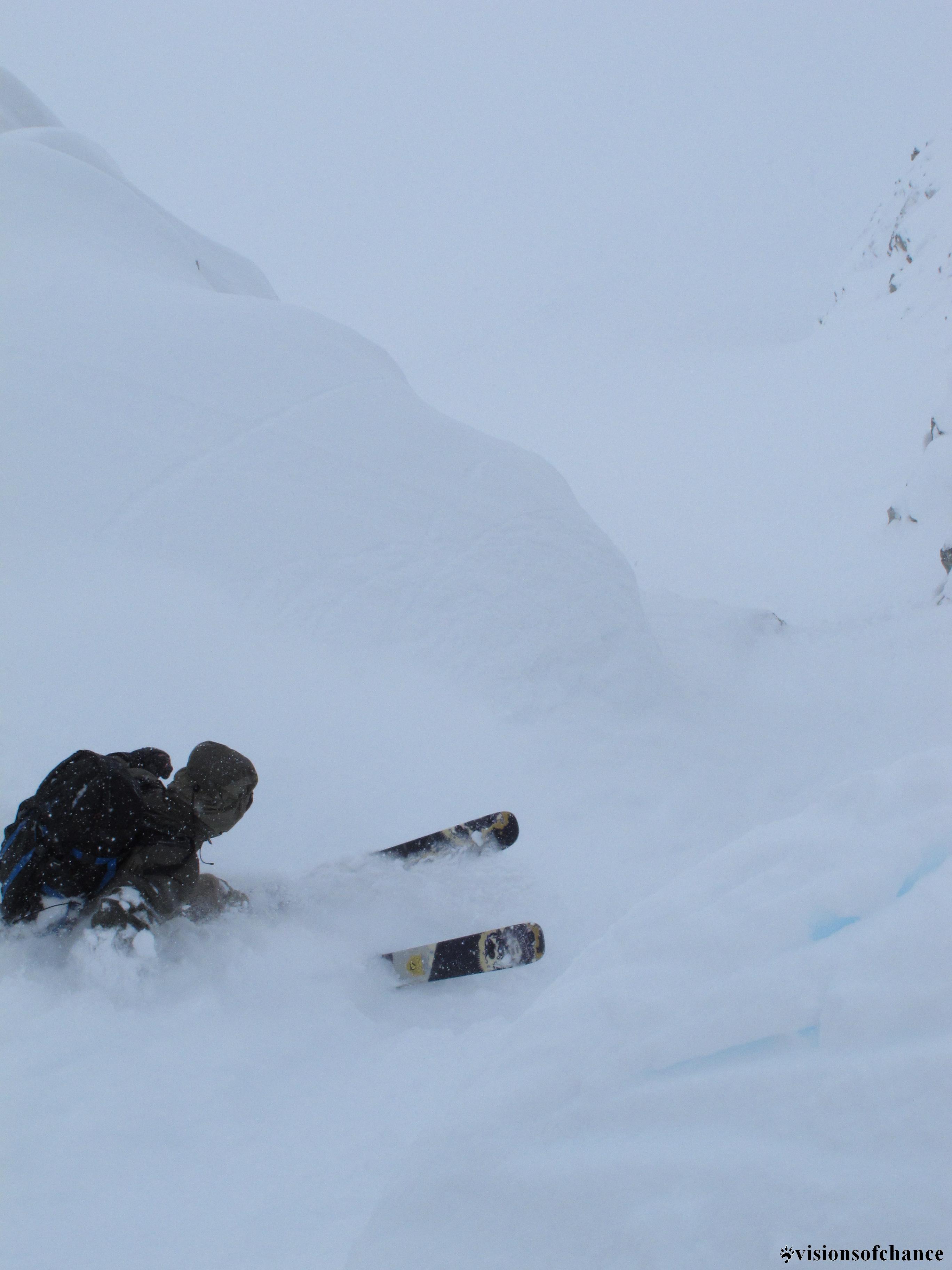 Jeff drops in first and jump turns down through the rocky choke, heading out right as the run opens up to the glaciers to avoid the open crevasses we know are on our left, hidden in the low light.