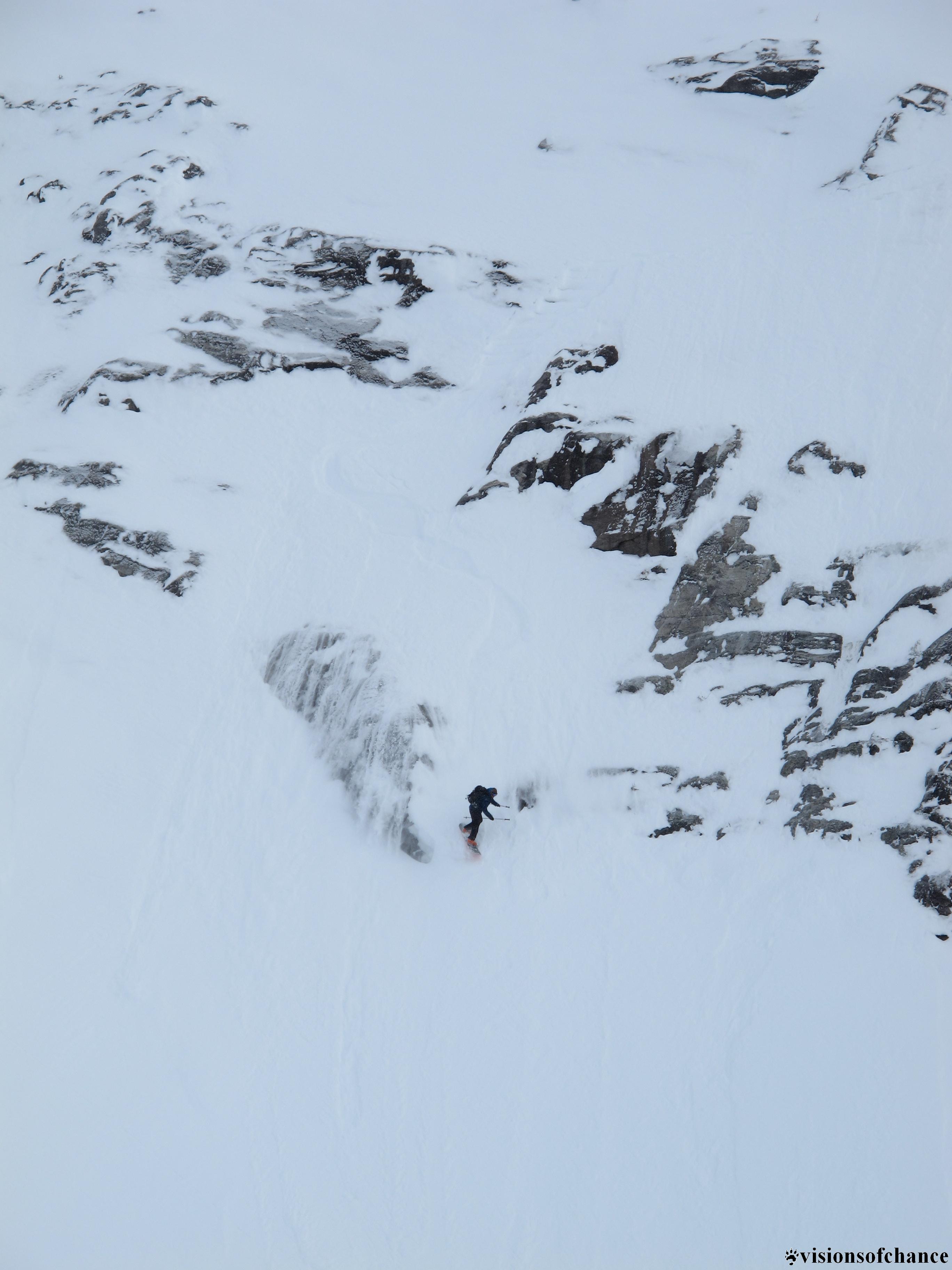 We carefully make our way down through the flat light until above the final steep rollover, peppered with some cliffs and rocks straight down, but which I remember can be bypassed on the right.