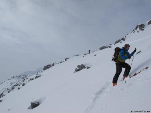 We skin up the bench that lead to the West face and push up the thinly veiled suncrust on skins, then switch to some alpine wallowing in facets and scattered rocks.