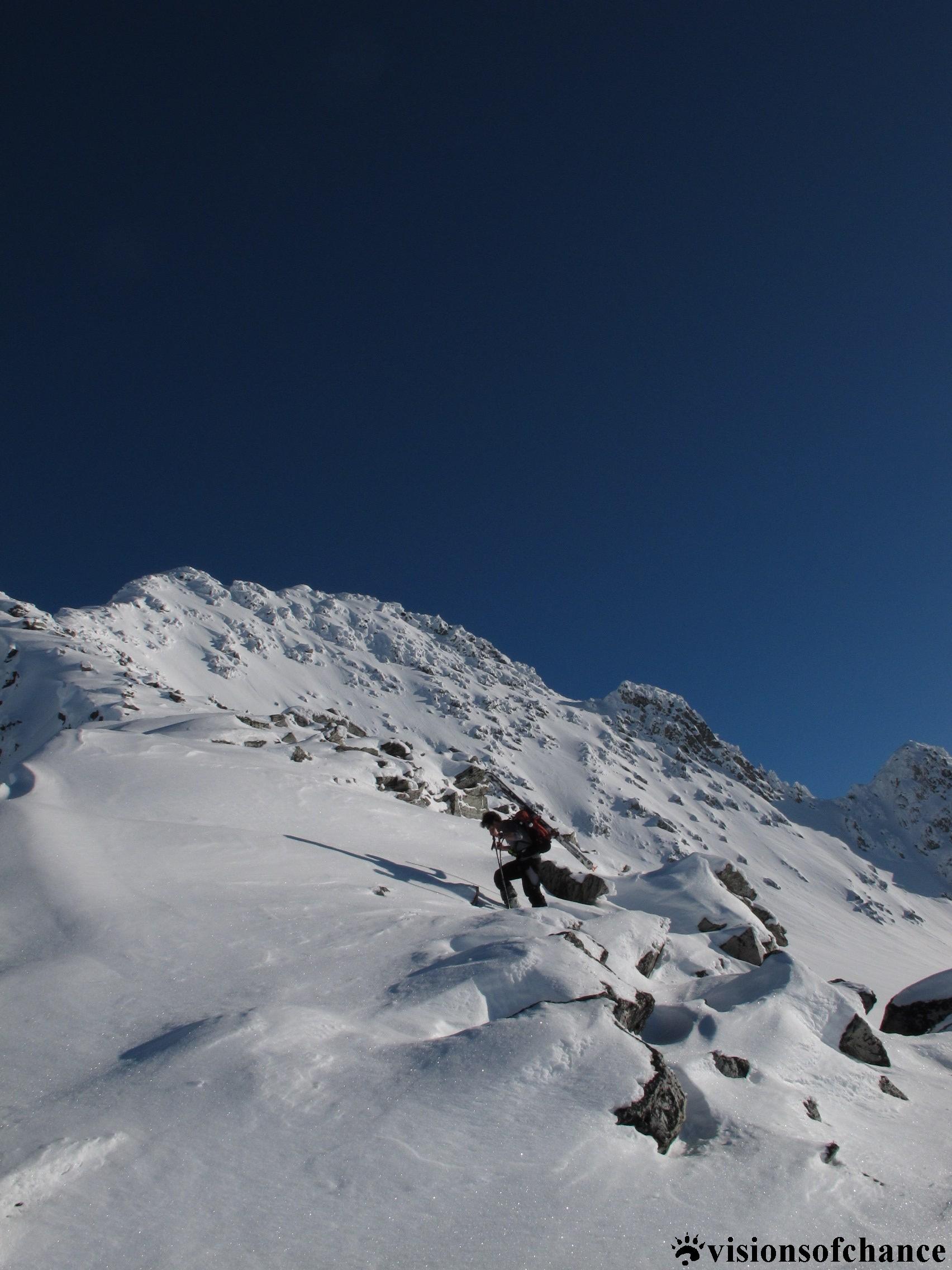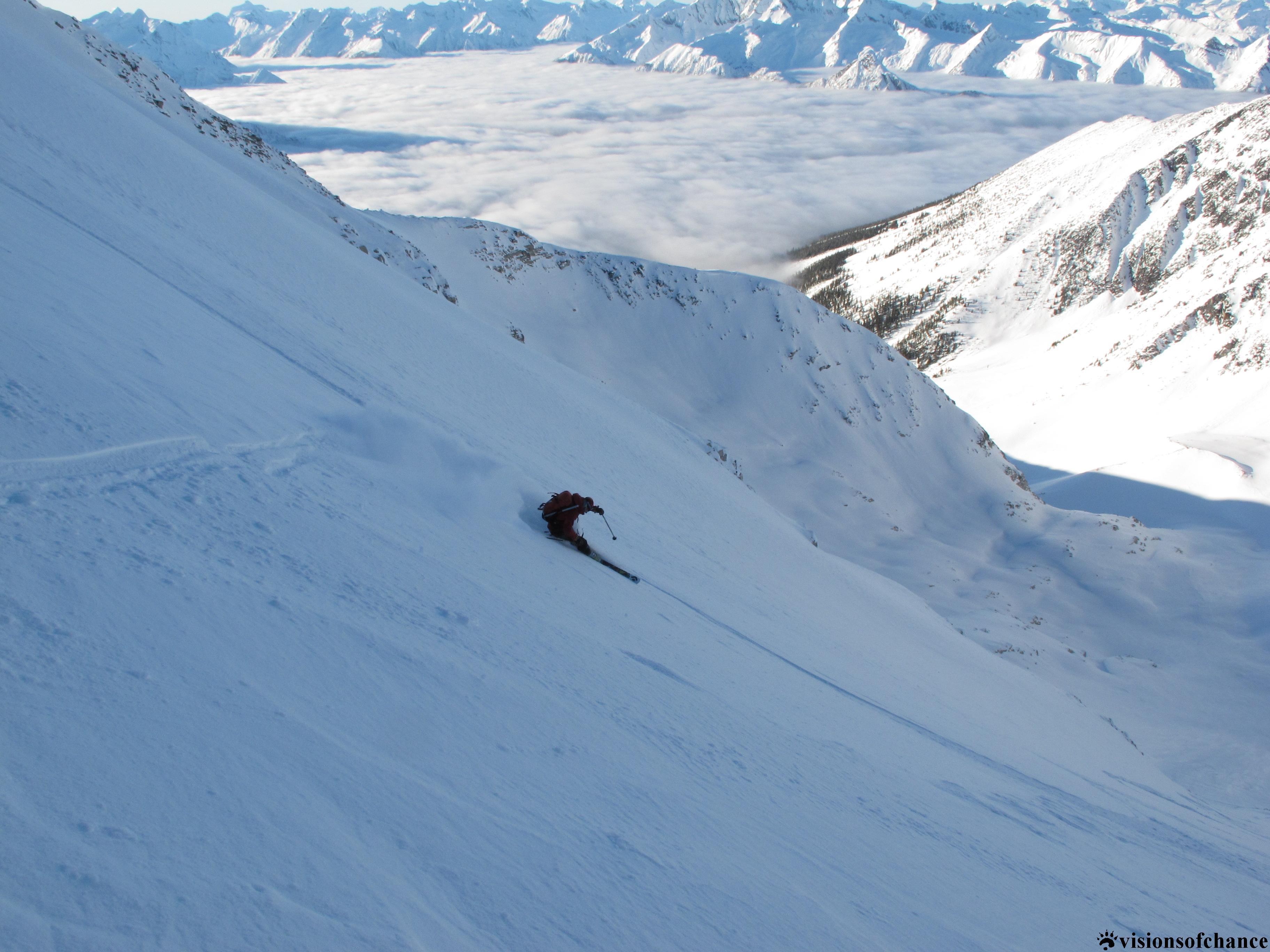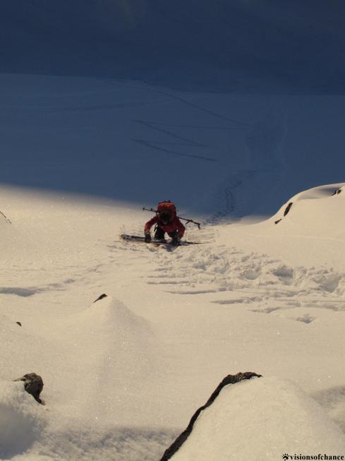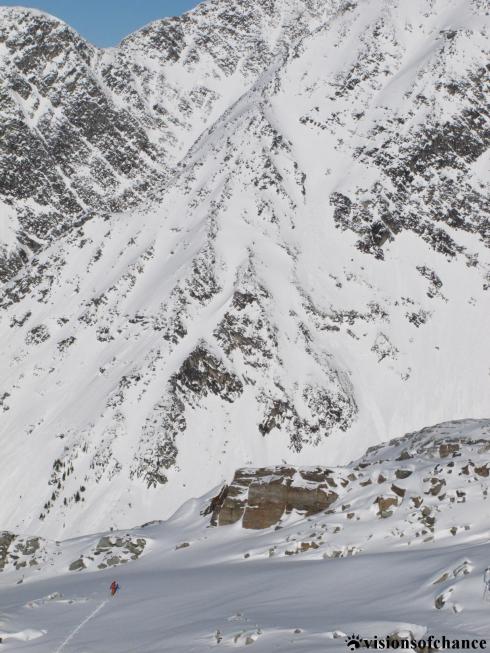 I edged my way along the rock rib that bordered the face on the skiers right, staying on top and cutting my way down until I could see a line down thru the choke. Phew! I won’t have to go way out onto the face out right. Slipping through, the rest of the line opened up right to valley bottom, and I did not stop until I reached a safe spot at the bottom. I watched Greg and Conor ess their way down this 2000 foot alpine face with the rush that I only get from skiing flooding thru my veins. YEAH!