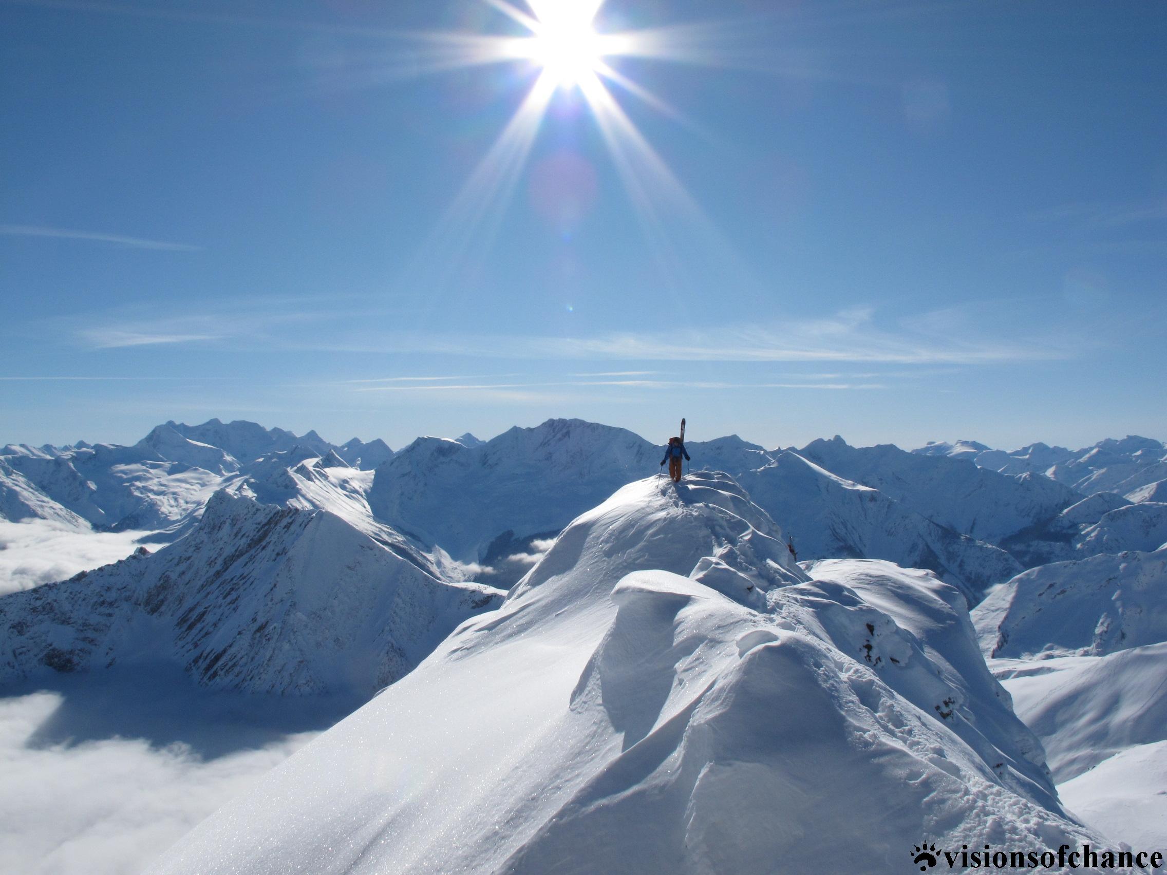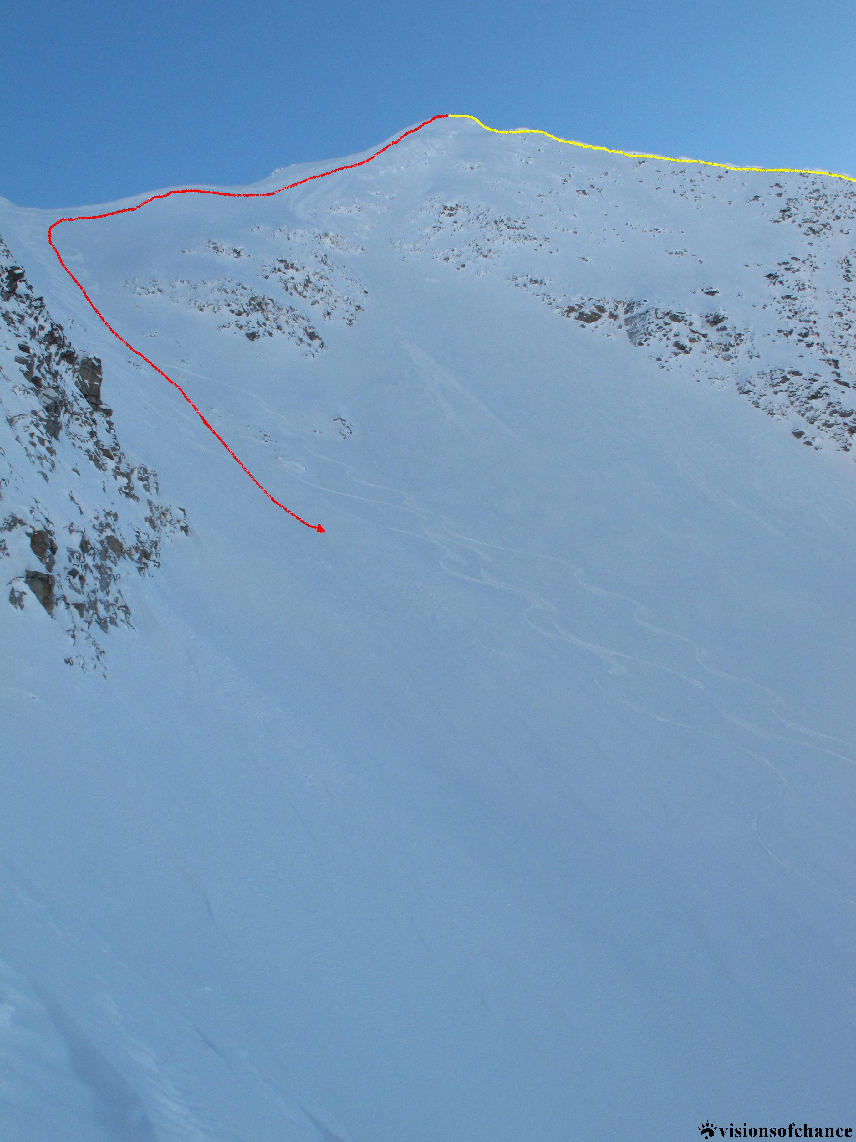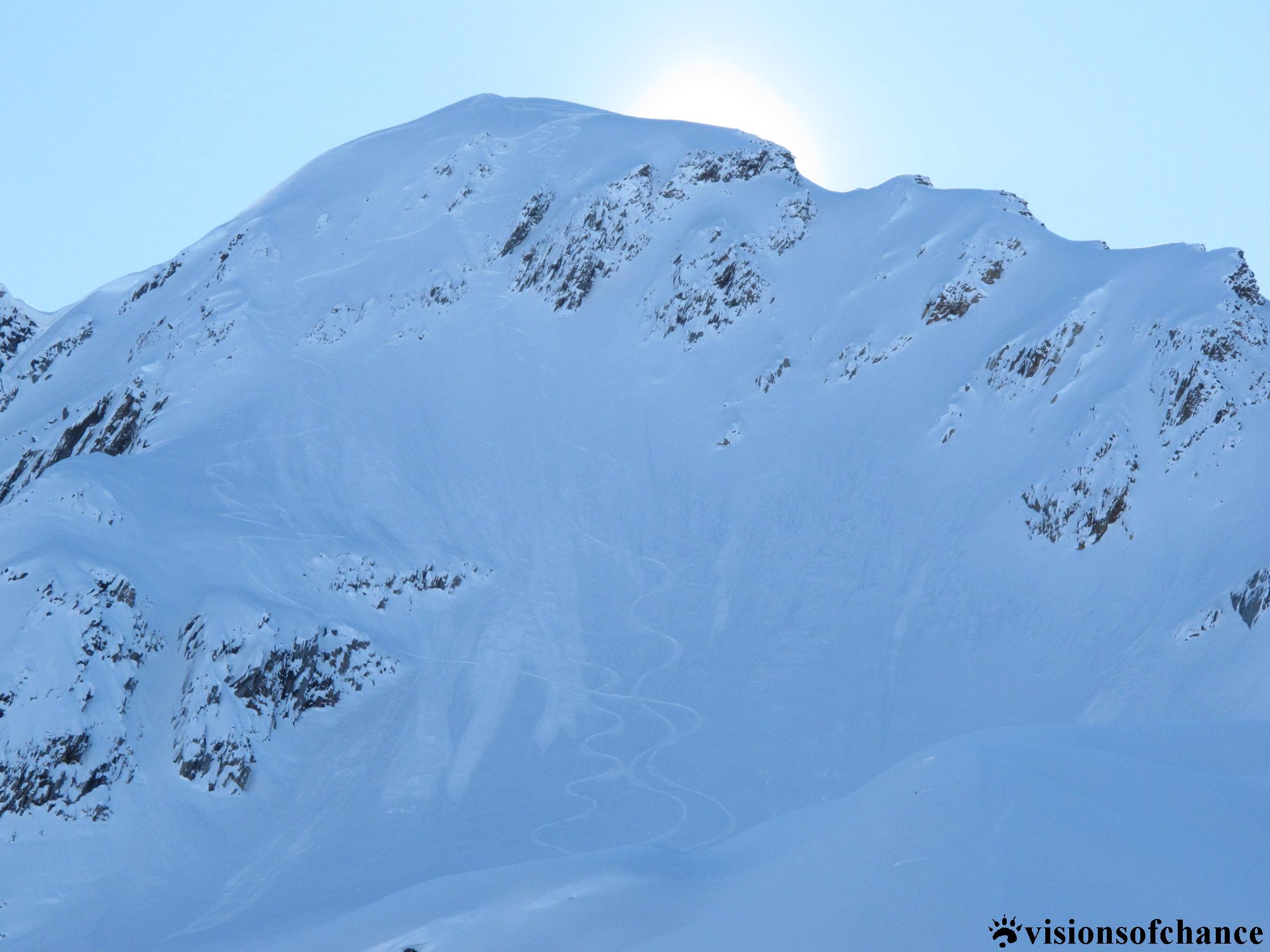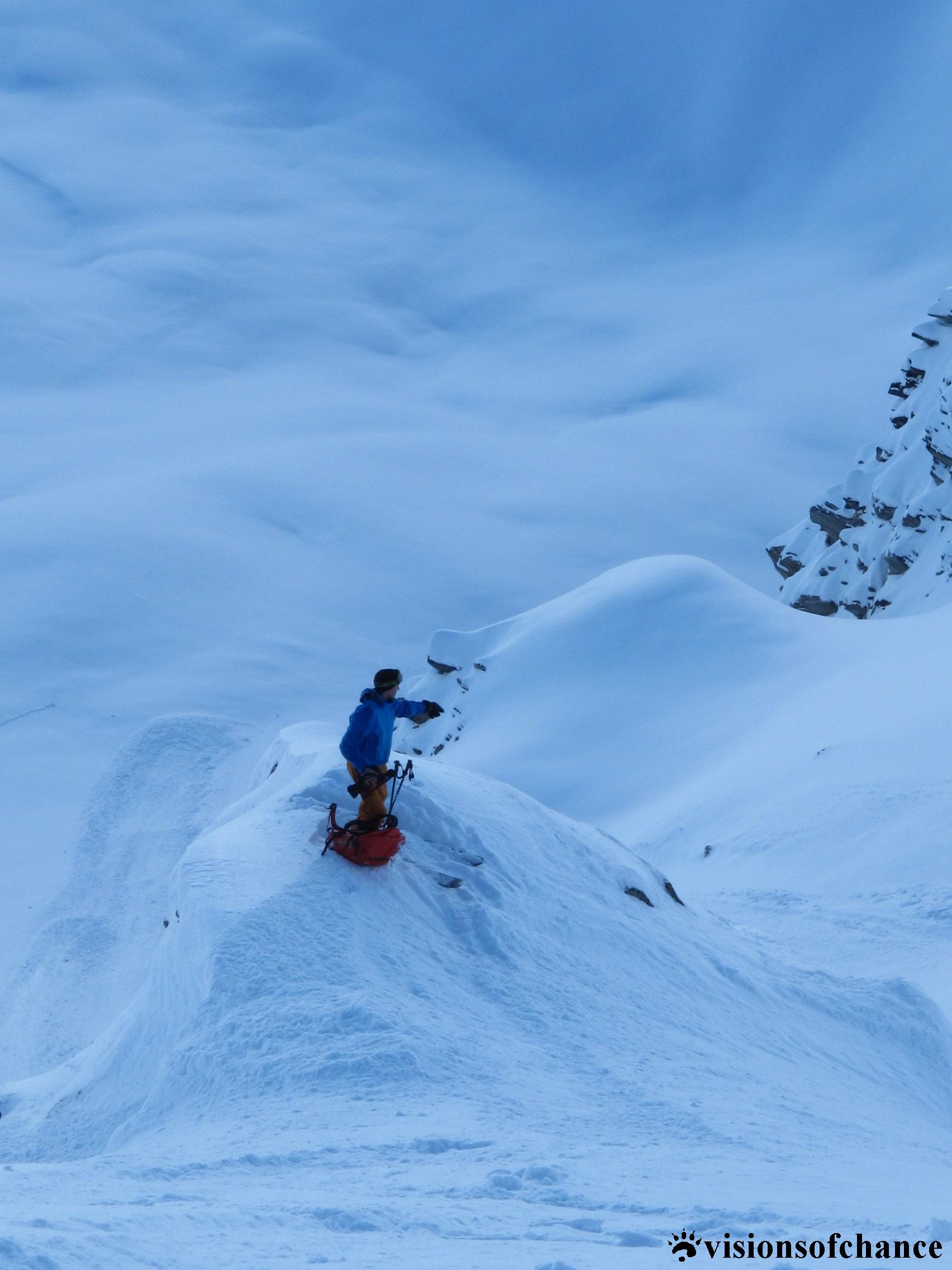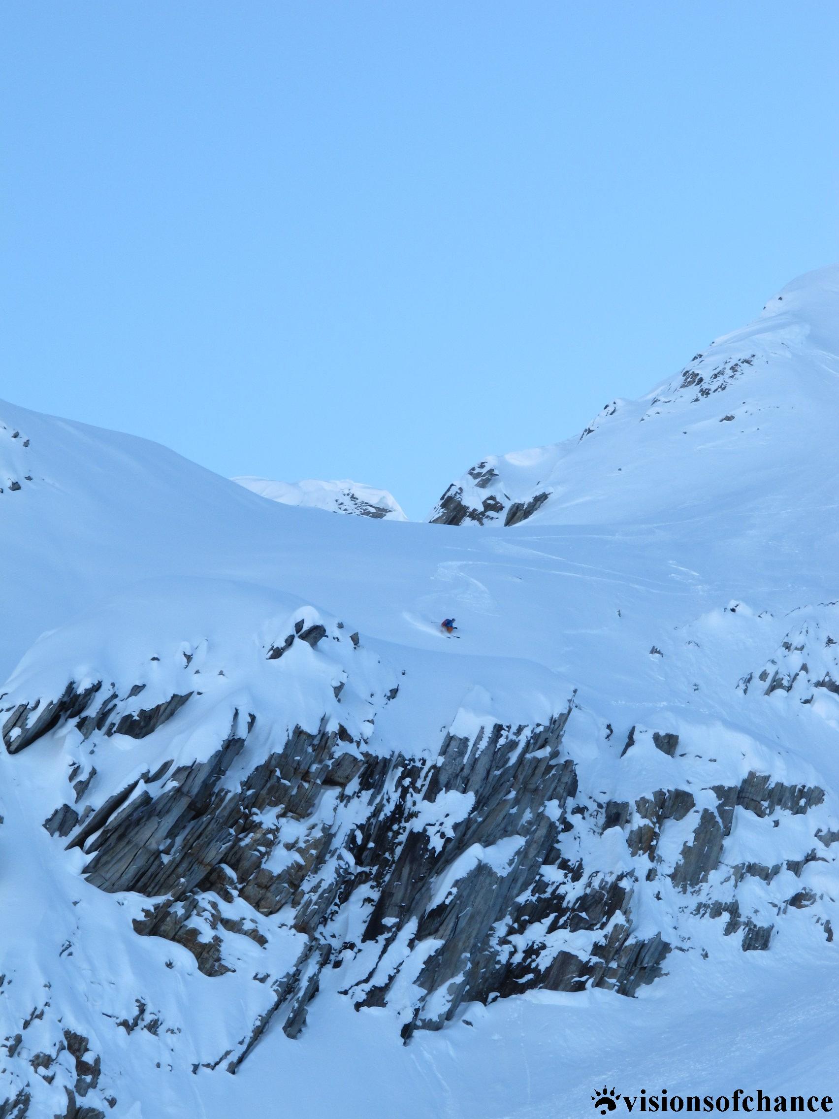 As we edged over the roll onto the E Face, our excitement grew. My heart pounded as we ski cut down the slope, with minimal results. It was looking really good, was this going to be the day? Were we actually going to ski this thing? It sure looks like it, there’s Greg down below, getting set up on a safe rib to film some action!