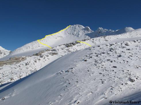 We accessed the N glacier on Sifton a bit further N on the ridge than our whiteout visit here a month ago to avoid a sketchy steep and rocky slope, and after crossing the glacier we gained the N ridge, a fine scramble.