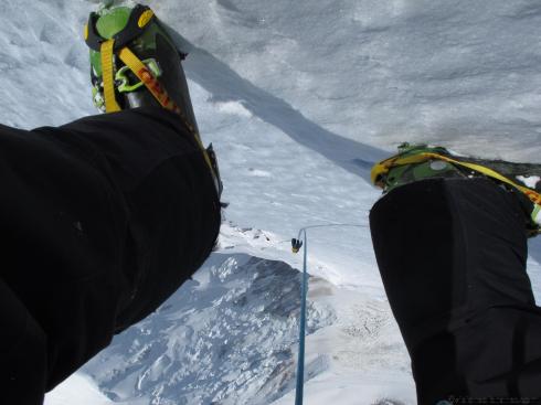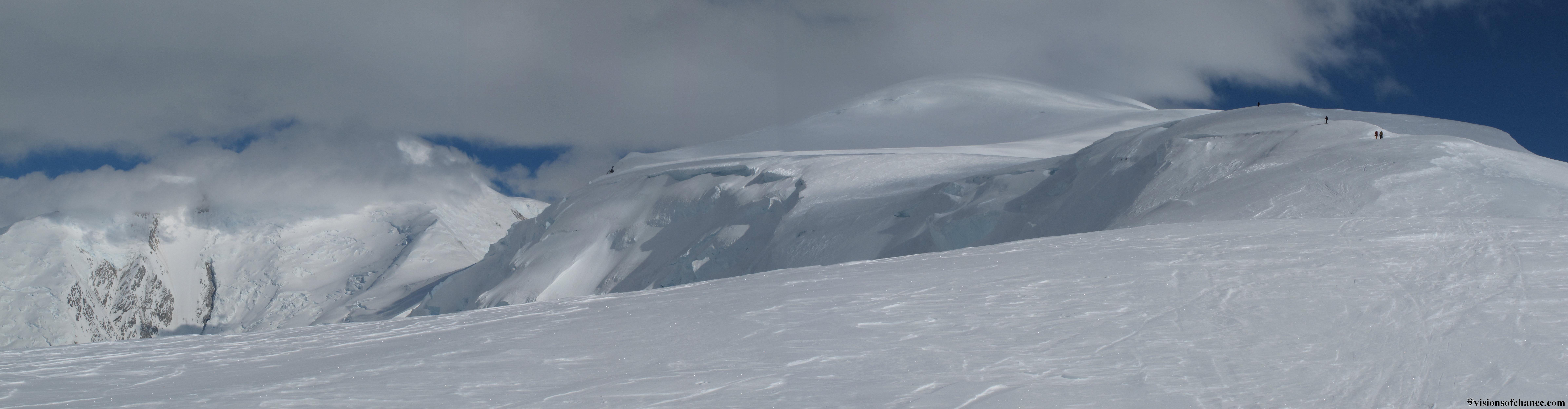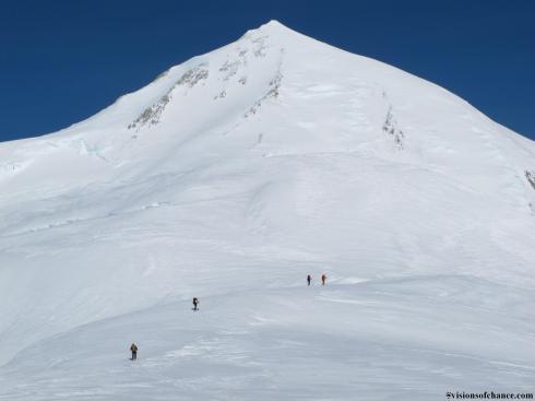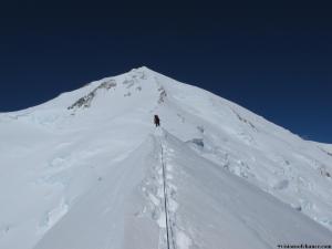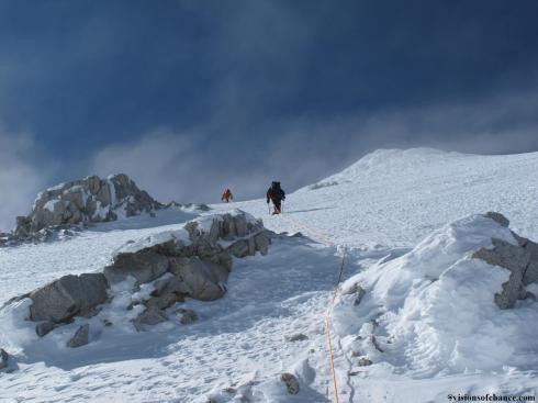 It came my turn to lead again, and I got into the rhythm of cramponing up the 45-50 degree melt freeze surface that covered the face. I can only describe it as pebbly ice mixed with a small amount of snow thinly covering both alpine ice and sun and wind blasted firm neve. Utilizing both ice screws and pickets to protect our fatigued rope team from any possible slips or trips, I pushed up to around 16,000′, a couple of pitches below the summit. Hammering two pins into an exposed section of firm rock for an anchor and descent rappel station, I belayed the crew up. We are getting there! The clouds on the horizon to the South East where slowly moving our way, and the final push was on with the hopes that we could summit and start the descent before the visibility crapped out. Greg and Dave were the first to reach the stance, and they headed out through the final pitches of snow with a few rock outcroppings to gain the ridge just below the summit.
