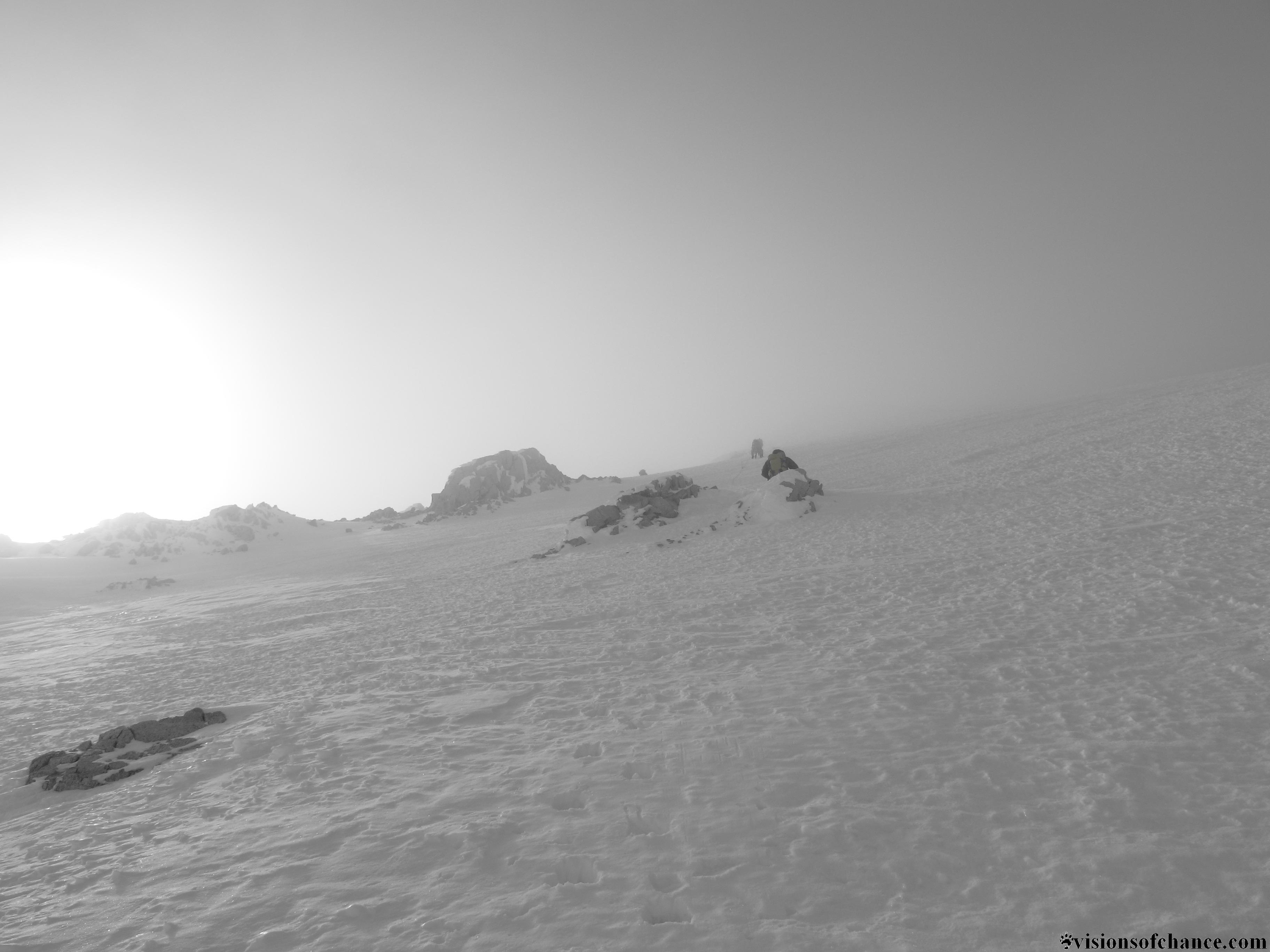 After post holing to a less precarious position on the ridge, Darek passed on the lead to me, and I set my sights on a couple of rocks poking out of the snow-covered ridge ahead,and started plodding along through the knee deep soft snow to firmer ground. A good amount of effort and the rocks didn’t seem to be getting much closer, so we stopped for a rest and re-group at a small bench, and Dave took over the sharp end of the rope.