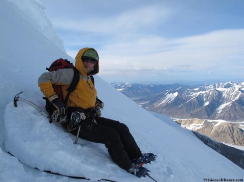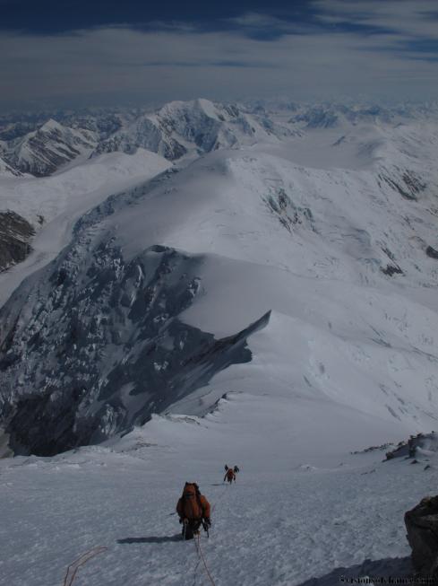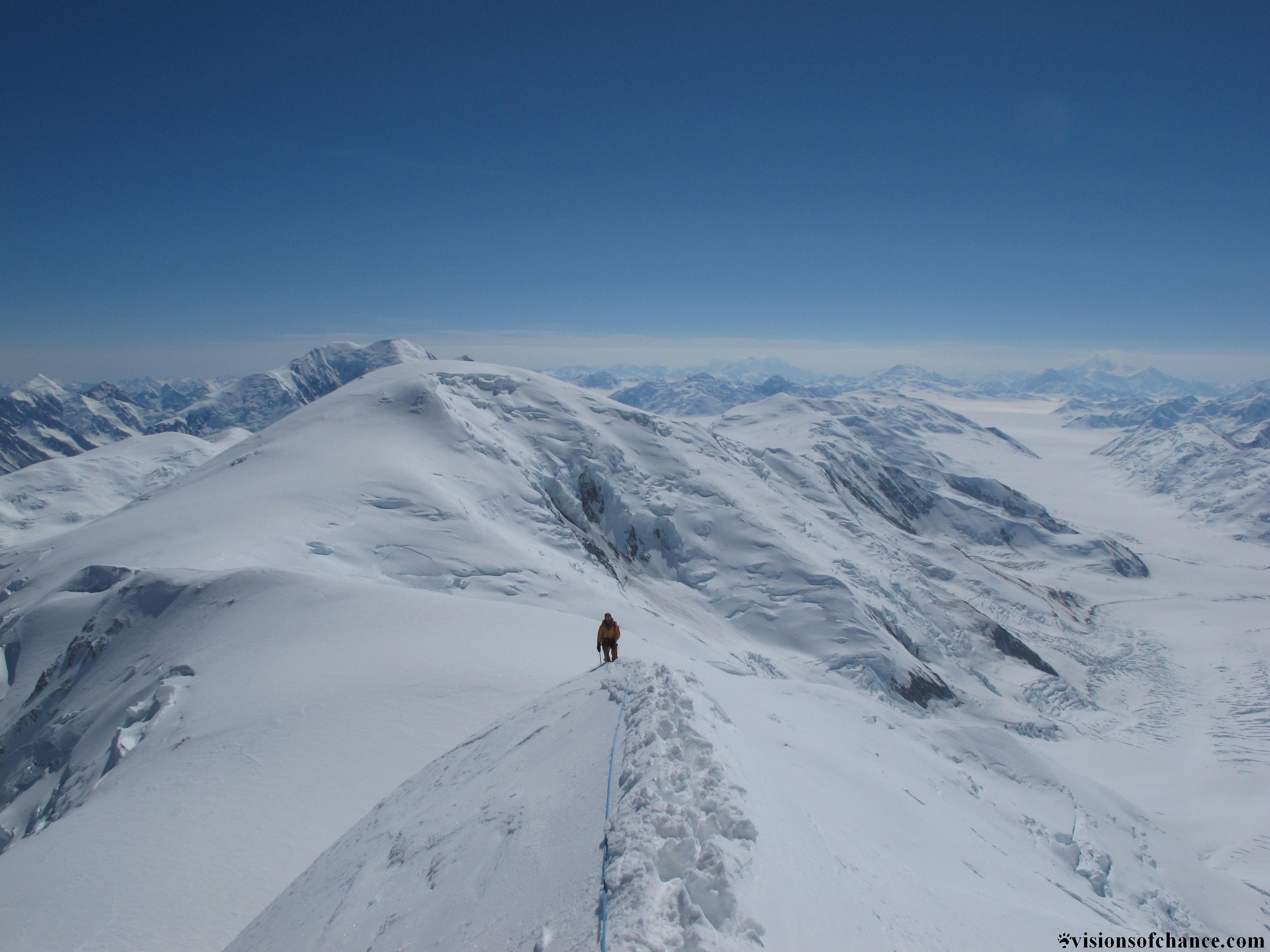 A few screws to protect the steeper bulges with a running belay (we had the 5 of us stretched out on two ropes, reclipping protection behind as it was passed, and collected by the guy on the tail end)and Darek led us onto an amazing knife-edge ridge with a 7000’+ drop straight down to the valley on the right and views right down the Walsh glacier to the huge massif of Mt Logan.