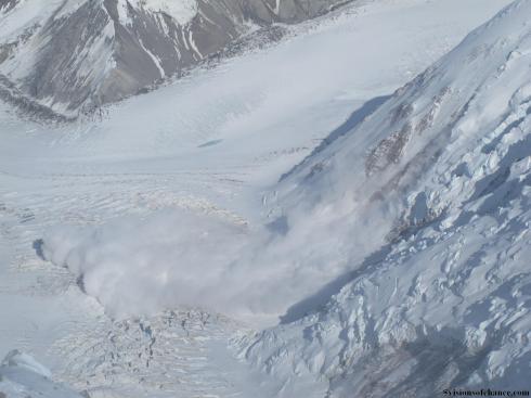 Our rope team crept up the face at a 5 steps-take-a-break pace, but soon enough we were all standing on the top of the world, 5,073m (16,667′) above sea level, the summit of Mt Steele, our main objective! And only seven days after being dropped off by the plane! The winds were blasting gradually thickening clouds across the peaks, so after a brief summit celebration and watching a huge icefall rip off the north aspect of the 14,000 foot hump, we turned our ski-less boots downhill.
