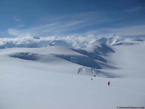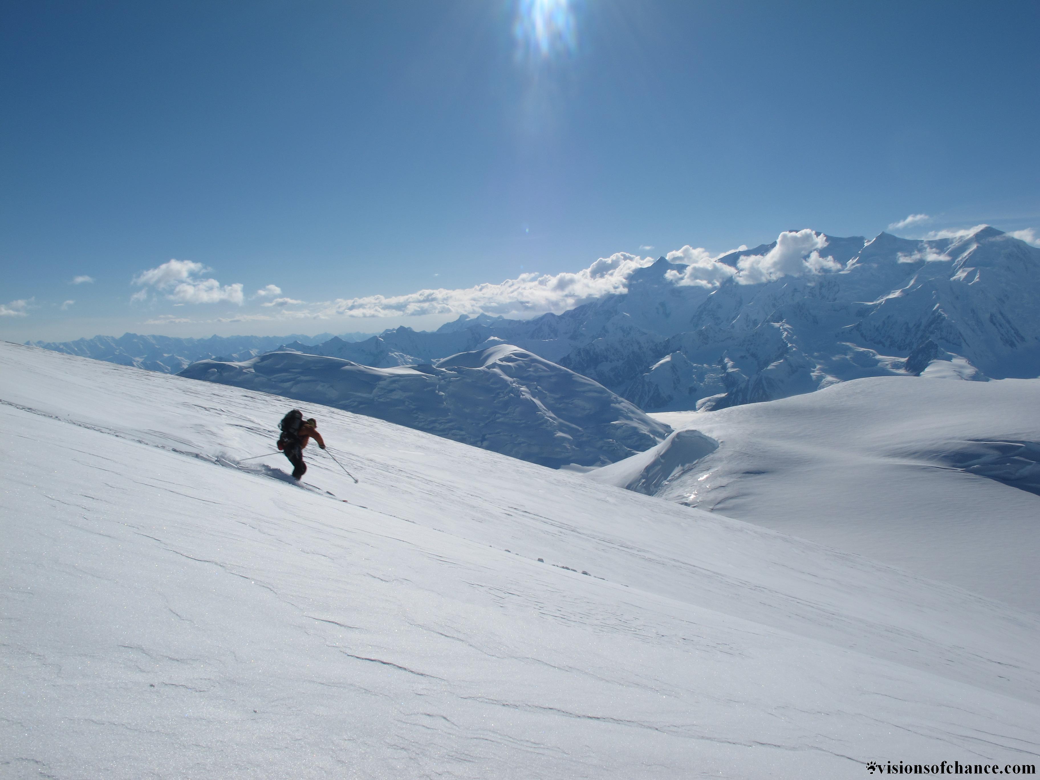 The fine weather continued the next day, which we spent acclimatizing by skiing on the heavily glaciated ridges defining the edges of the Upper Walsh glacier. A steep 1000′ shot on a South face to start, and the photo’s below show run #2, 2000′ of NW facing boot top powder.