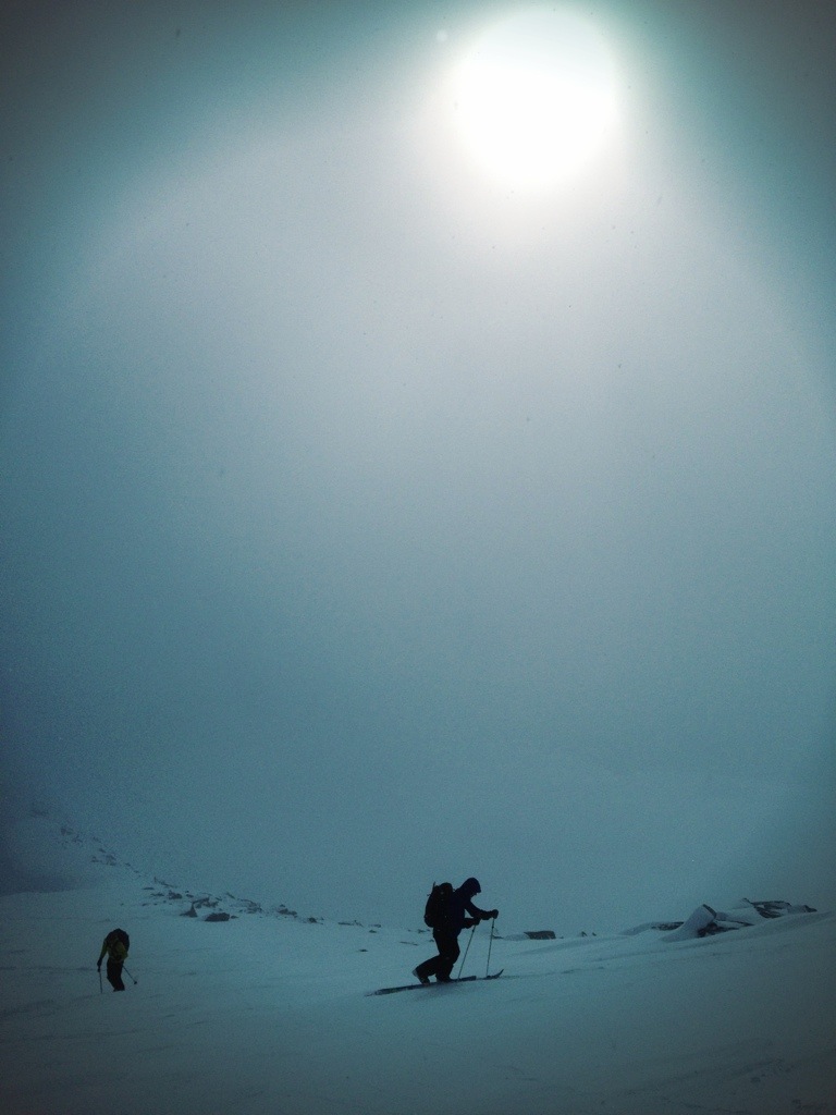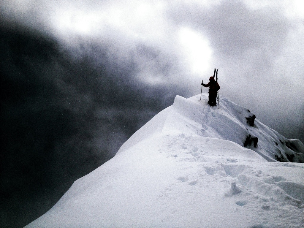 Just had to go out the next day, things were/are that good. We started out a large posse, and clear skies in the morning had lofty objectives being tossed around. By mid morning the viz wasn’t what it was, and we all ended up on Video Peak. Here we parted ways, Conor H., Chris D. and myself heading N while the rest of the crew dropped S. As we pushed the track up the glacier on the north side of Bruins pass the visibility improved, so we did a hot lap on the N side of 8812. On up to Bruins pass to finish with the über classic 8812 Bowl in the evening light, 7600′.