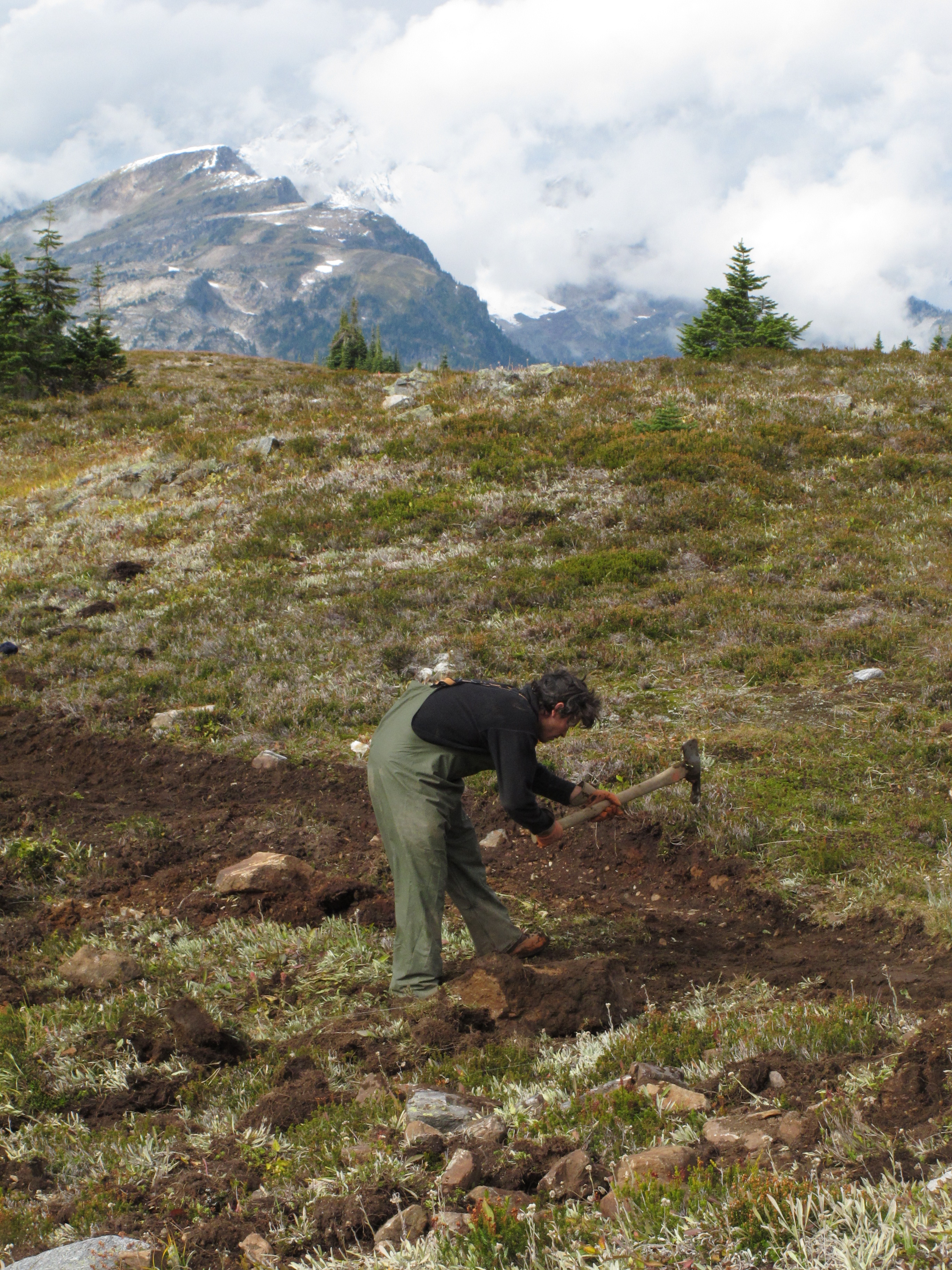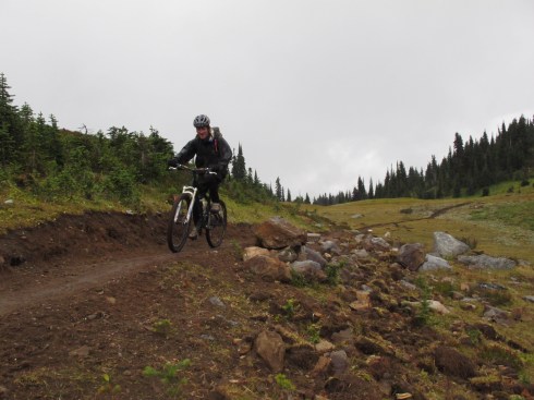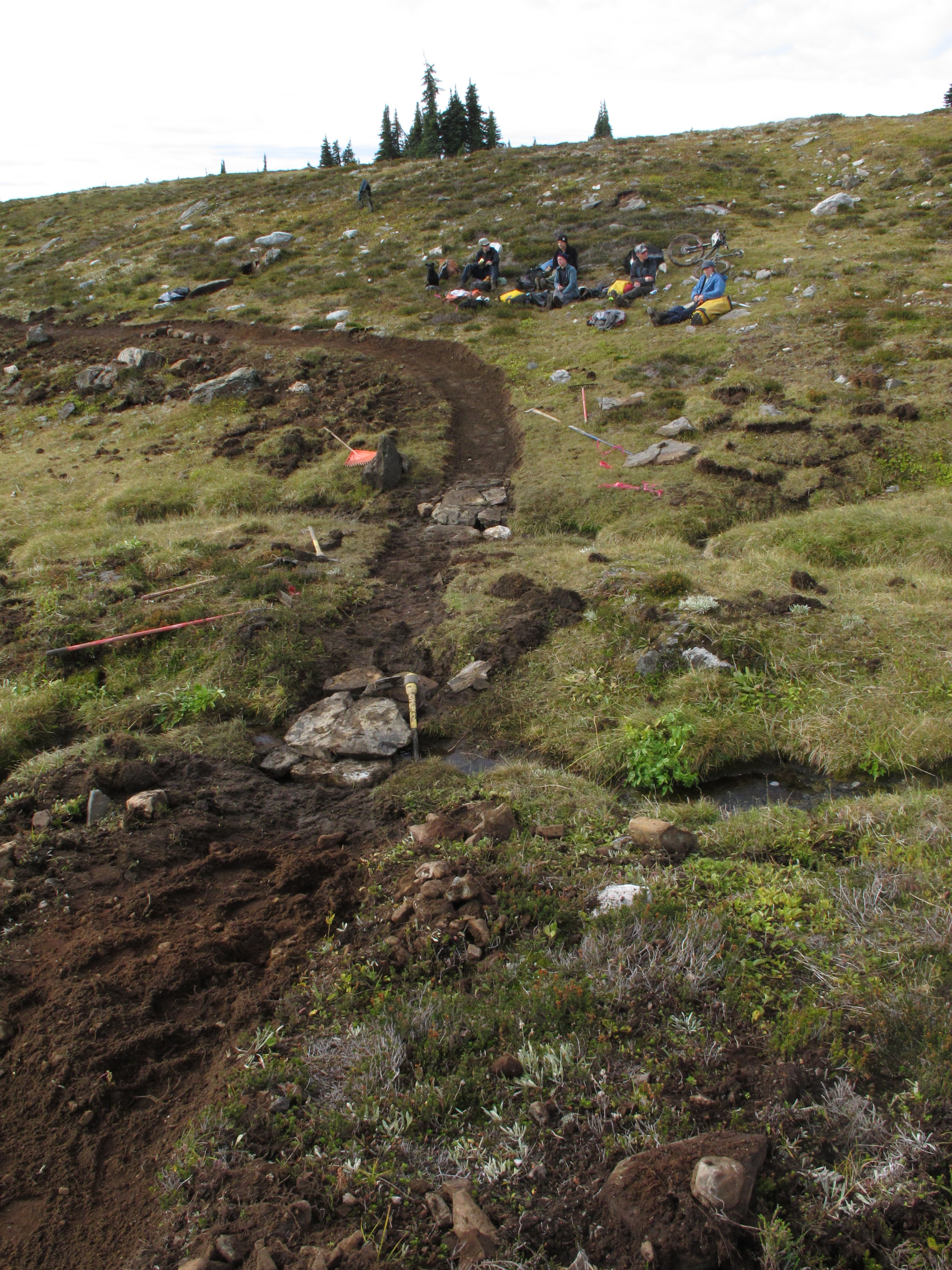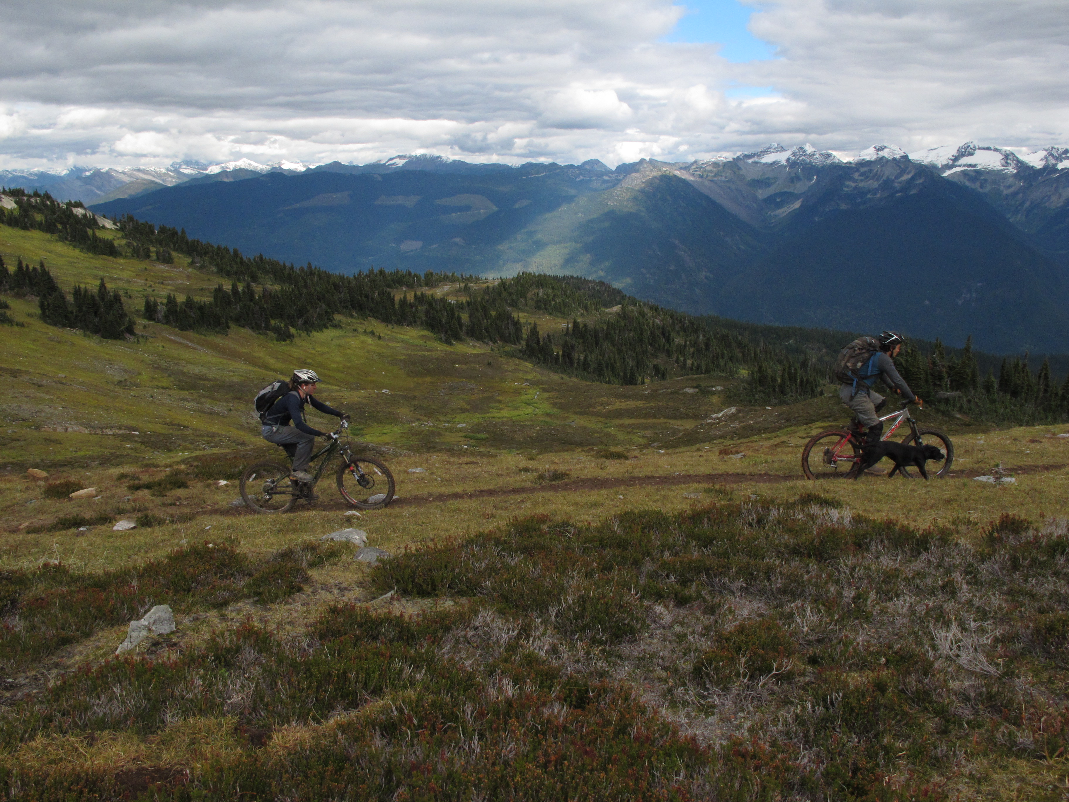 All of the sudden we are into fall! A couple of dustings in the peaks lets us know the time of year that we all love is just around the corner, edging out the memories of the summer with the anticipation of skiing. For me, since the Yukon, it has been nose to the grindstone, head down in the thick vegetation and slash that cover the clearcuts on the shoulders of the mountains that turn in to the ultimate playgound with a cloak of snow. The highlight of the season’s toil has been working on a new mountain bike trail on Frisby Ridge, which runs roughly North/South for almost 20km right above Revelstoke. Around 12km of sweet singletrack was grubbed out by four different crews in August and September, starting from a landing at around 1300m, winding through an established plantation into the forest, and breaking out into gorgeous rolling subalpine terrain at 2000m. About half of our crew’s 3km section was in the subalpine zone, and when it wasn’t slashing rain, what a spectacular place to work! The trail has been flagged out all the way out to the end of the ridge, the freshly minted first 12k is already outstanding, when the whole thing is done this trail is going to EPIC!