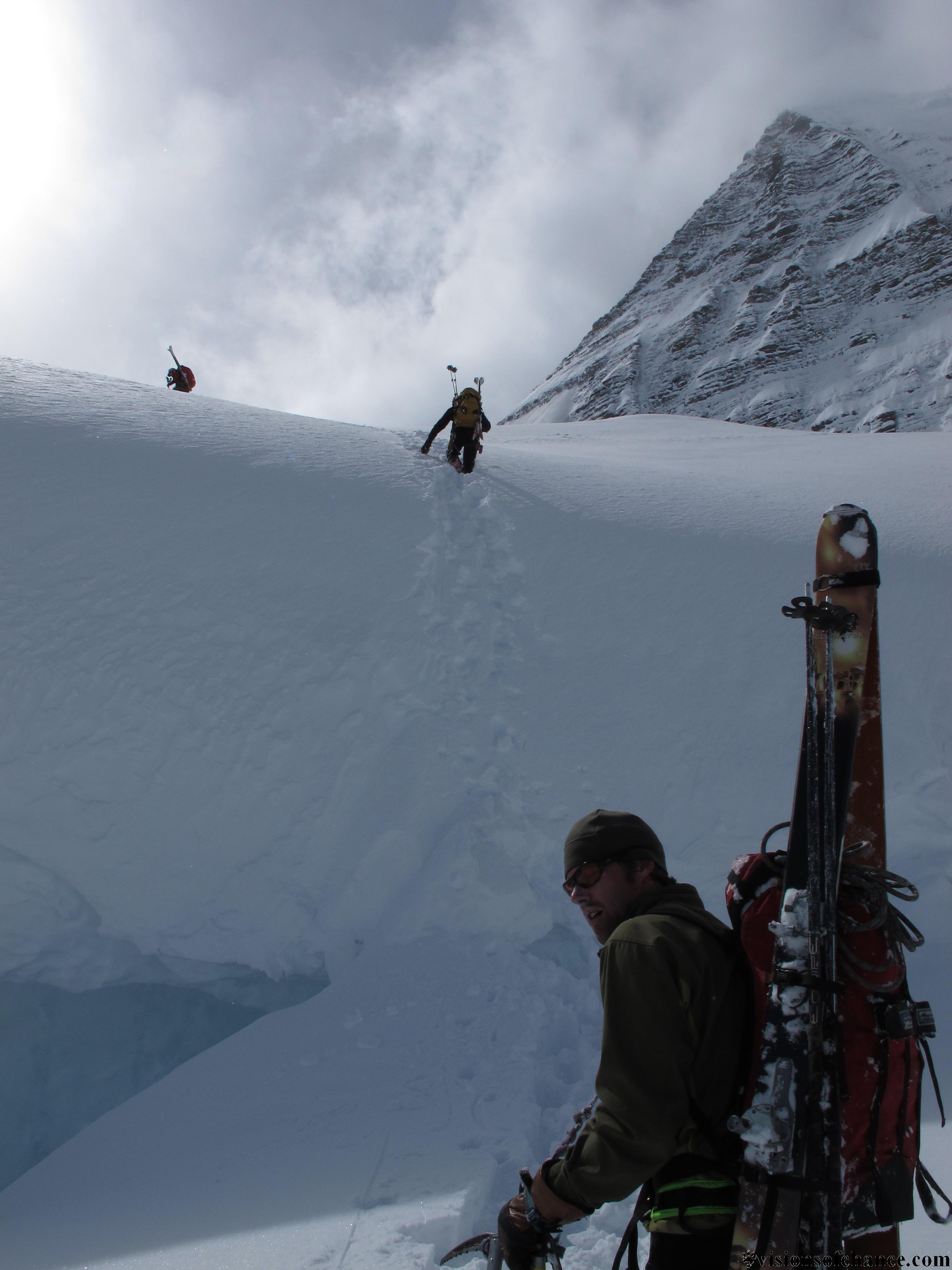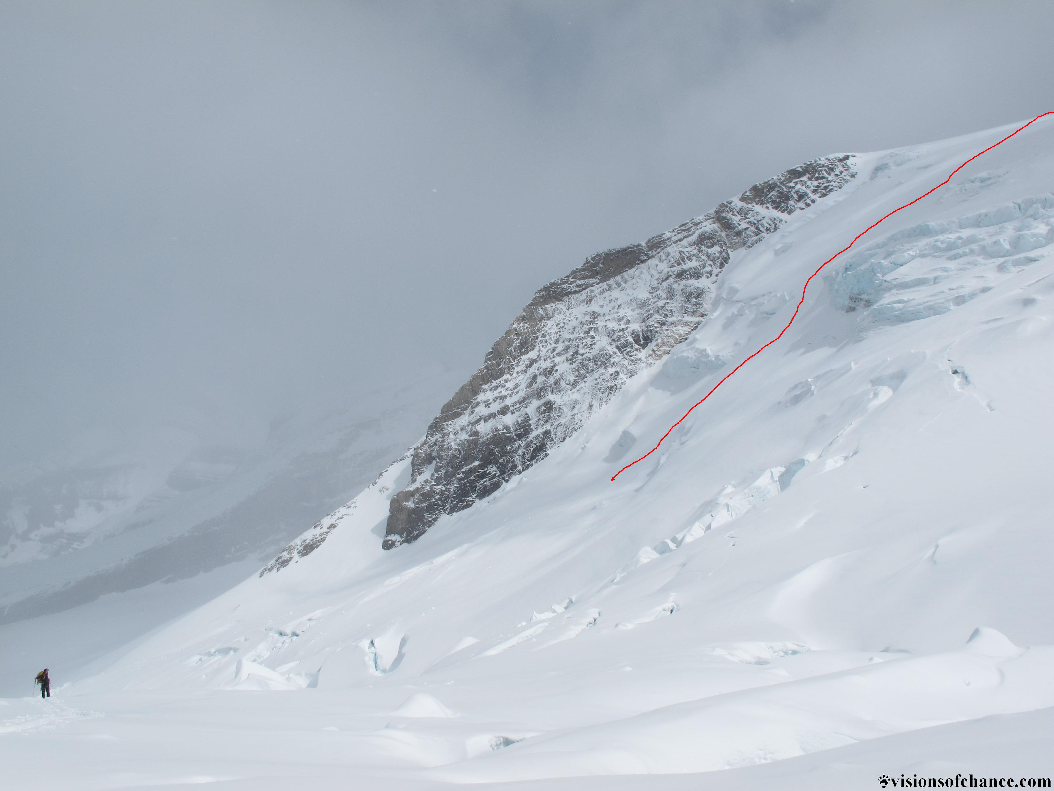 After negotiating a HUGE crevasse bridged by a cornice with a steep bootpack , we were finally on the bench directly below the face.