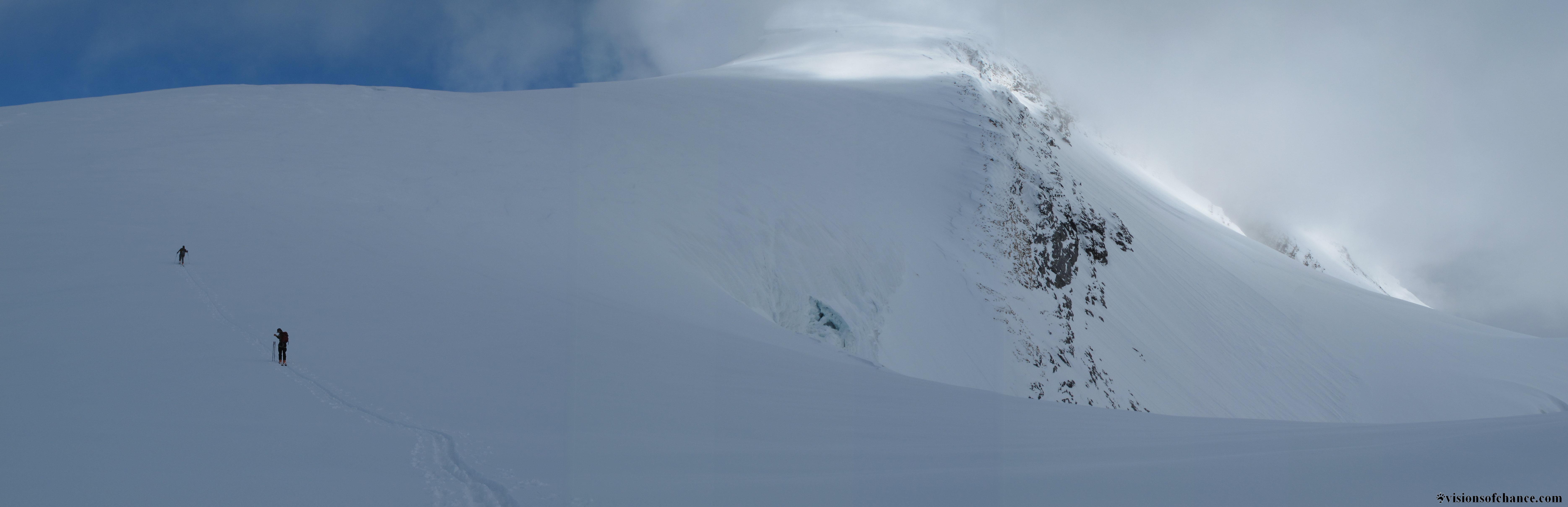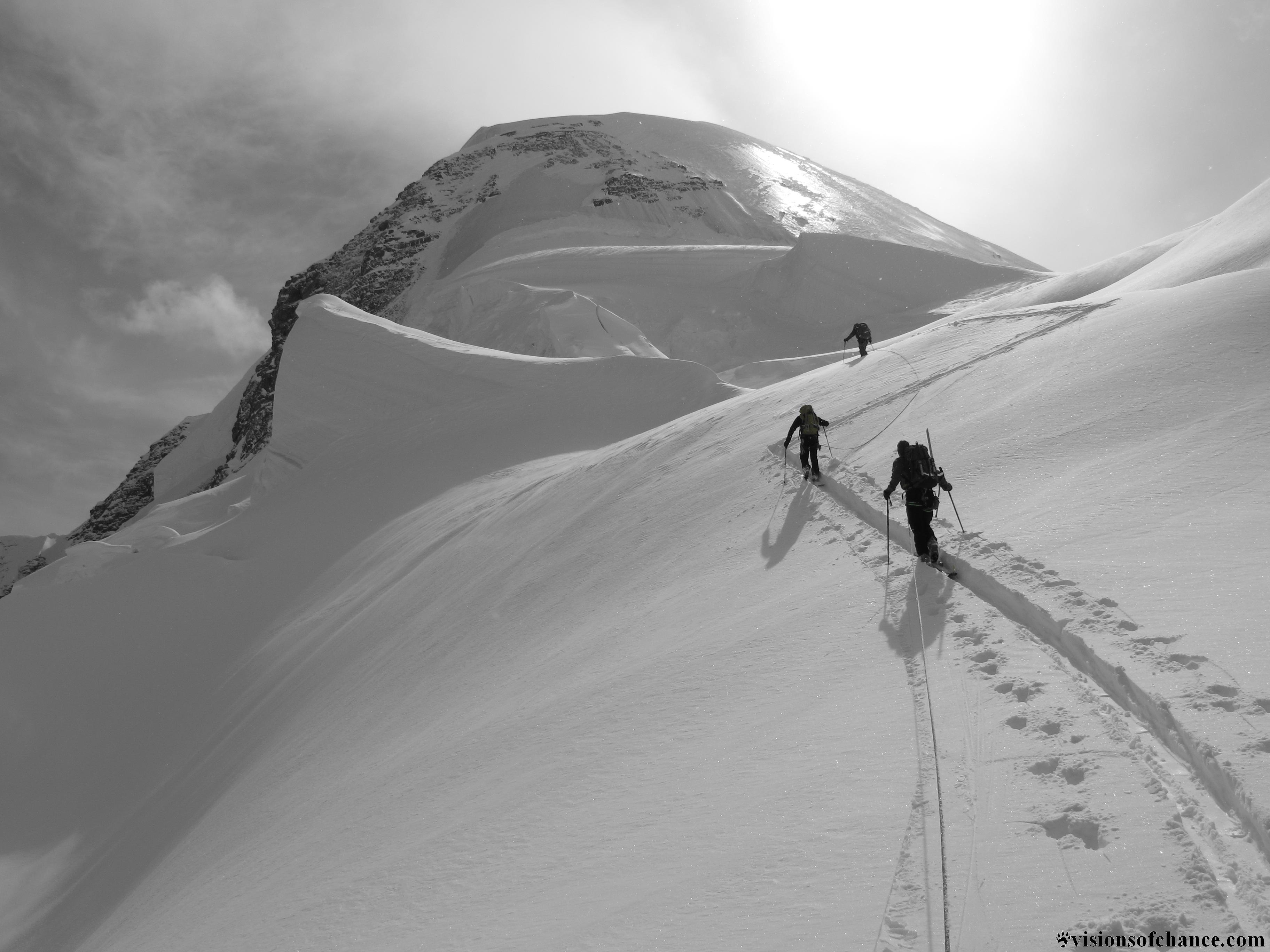 A turn up the broad ridge leading to the obscured summit of Resplendent, and a half hour later we are there! What a great tour, with great friends, and awesome to be succesful this time!