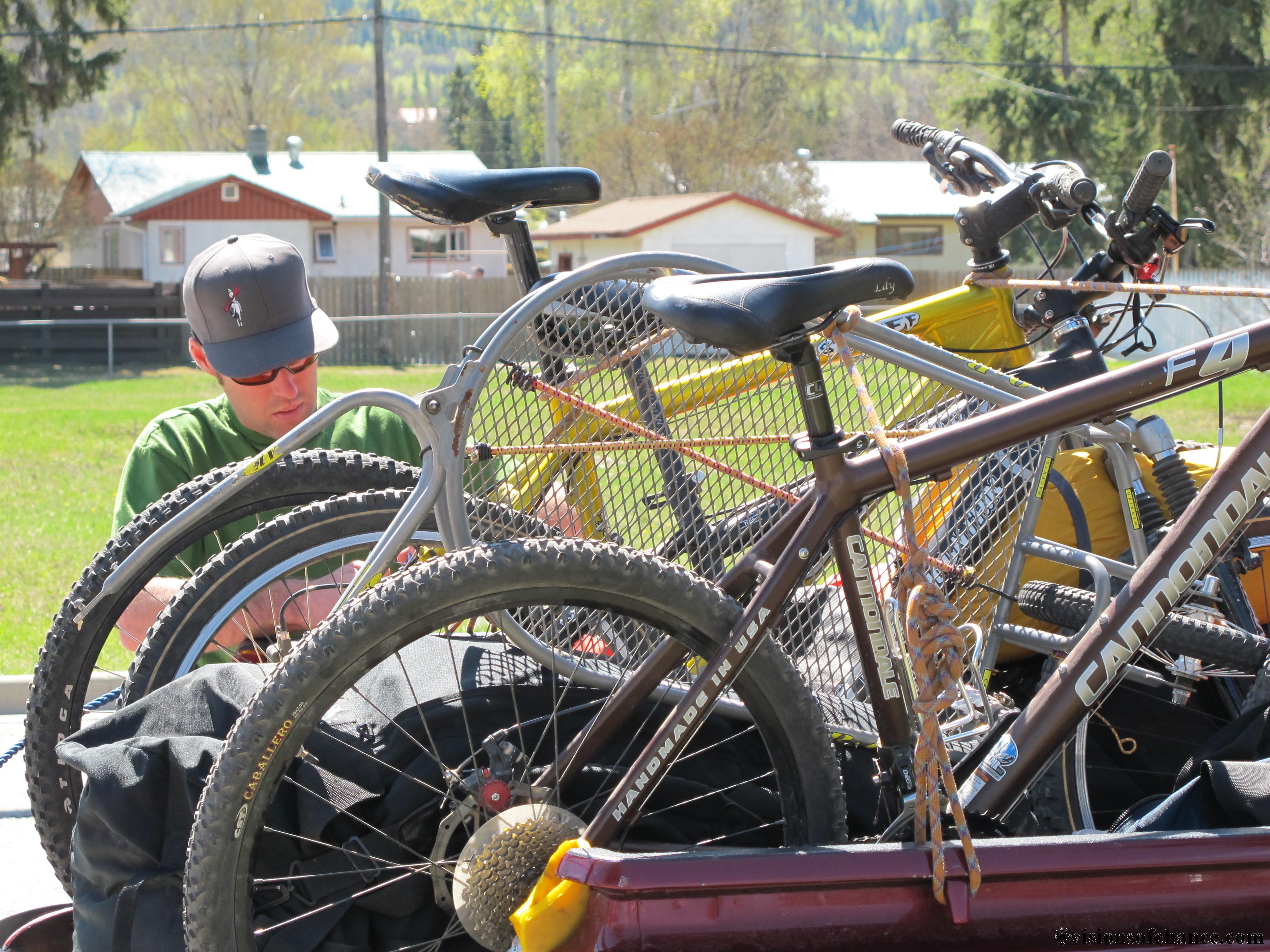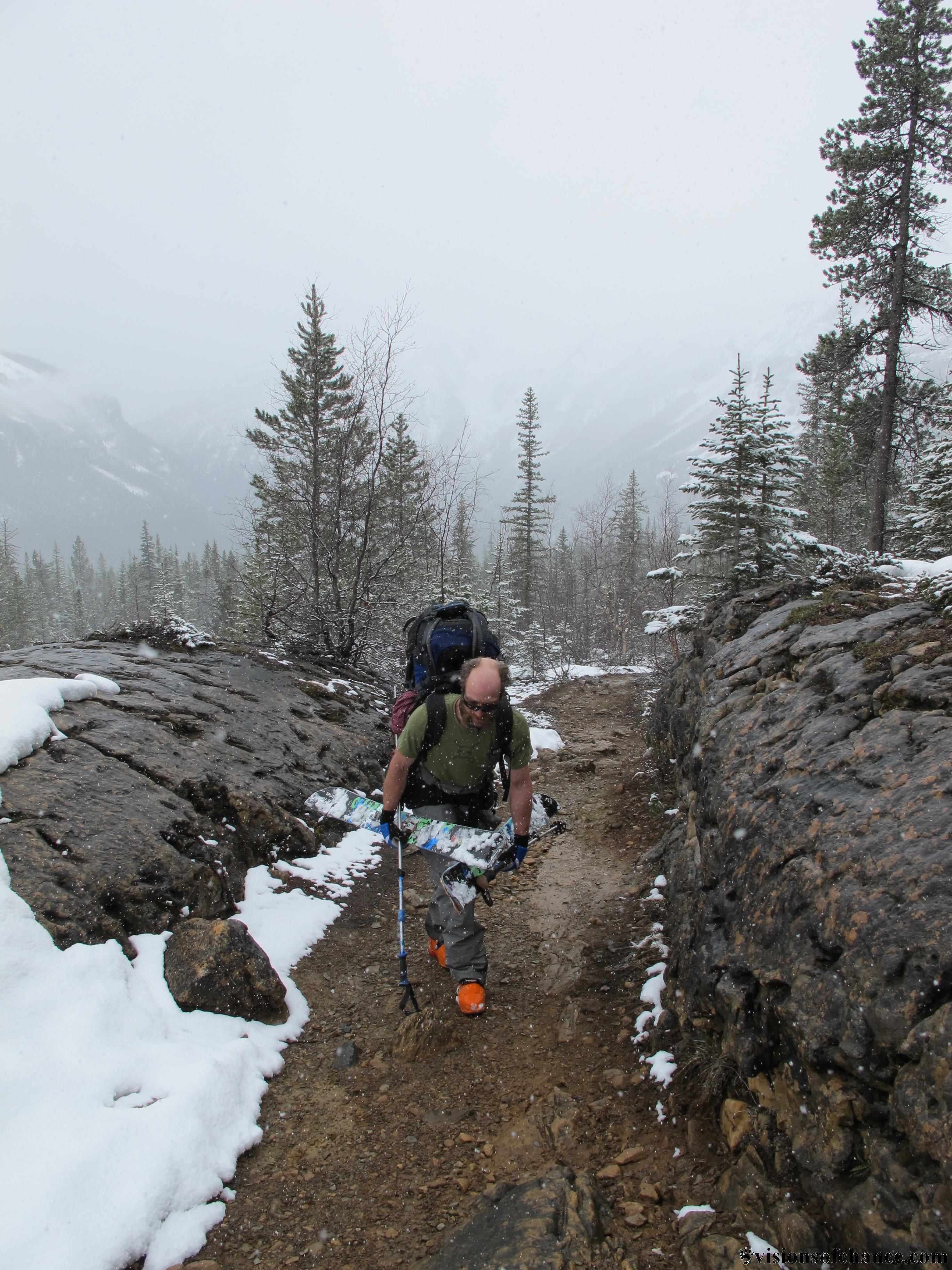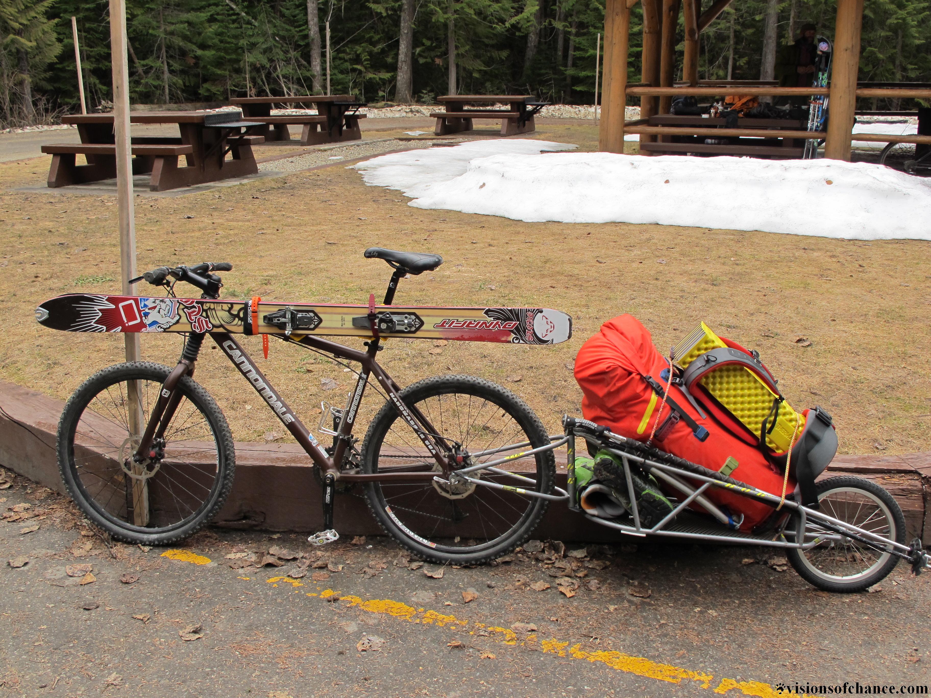 All were accounted for in the a.m., and we packed up our loads, stoked to be using bikes to access some Rockies skiing. I had along a BOB bike trailer to take the weight off my back, but I initially packed a little top-heavy and the bike was a pain to push up the steep incline just before Kinney lake. Soon we were parking at the convenient bike rack, locked em up and starting the walking part of the 25 km journey to Berg lake.