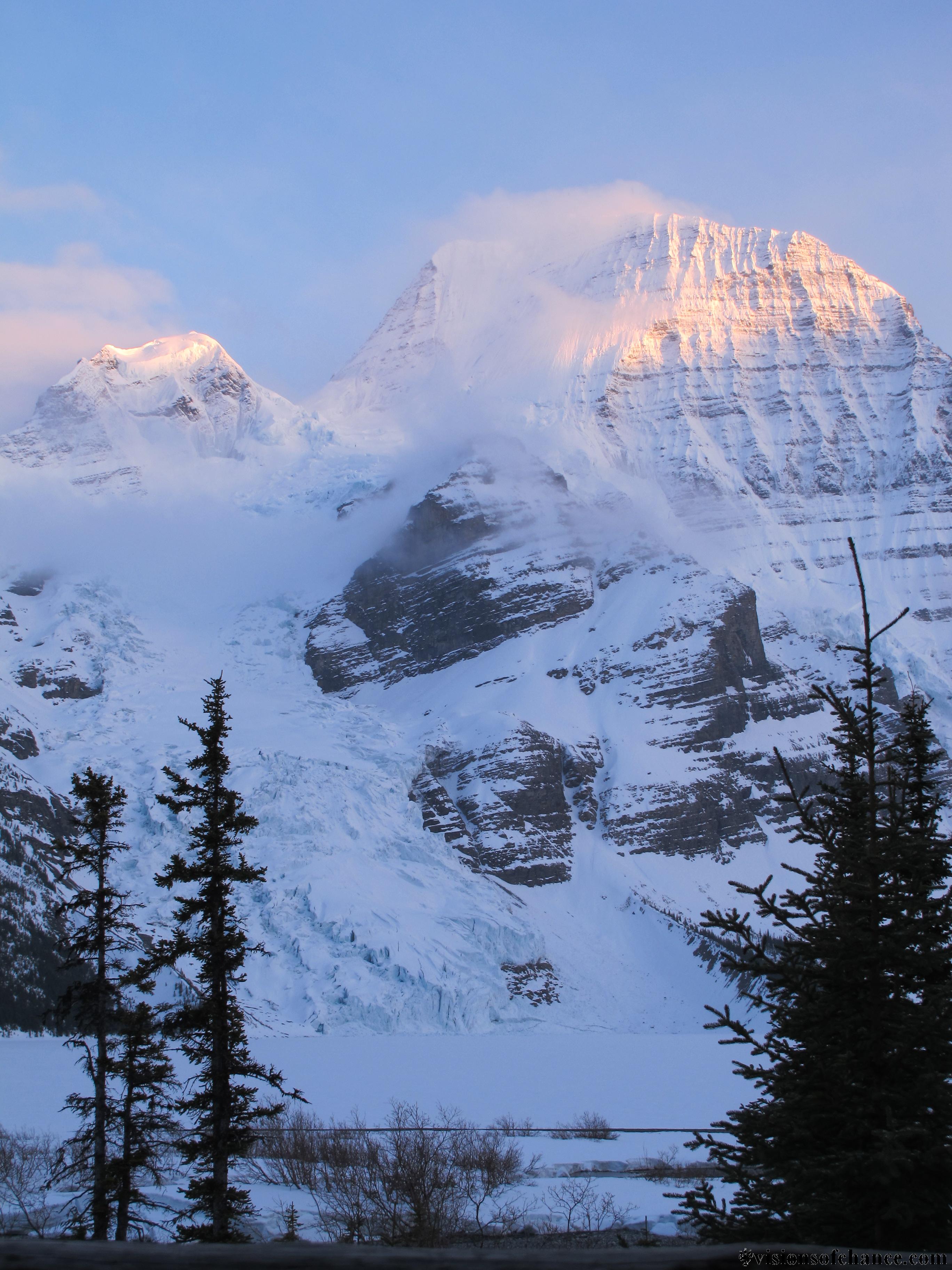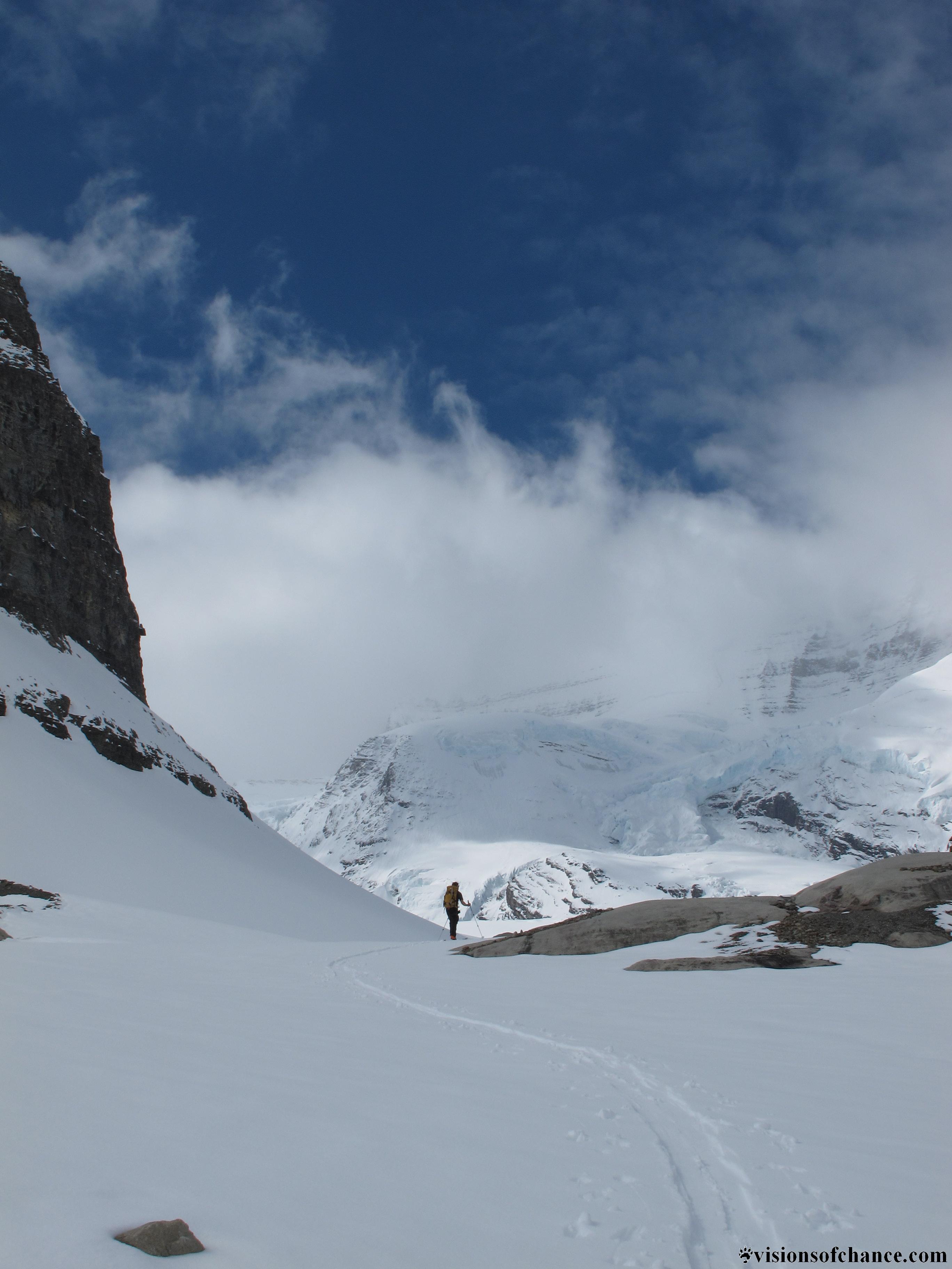 The long slog up the Robson glacier happens under mostly blue skies, but the tops of the peaks continue to catch the clouds, with windows offering views of steep flutes, sheer rock and ice faces, and stunning ridgelines.