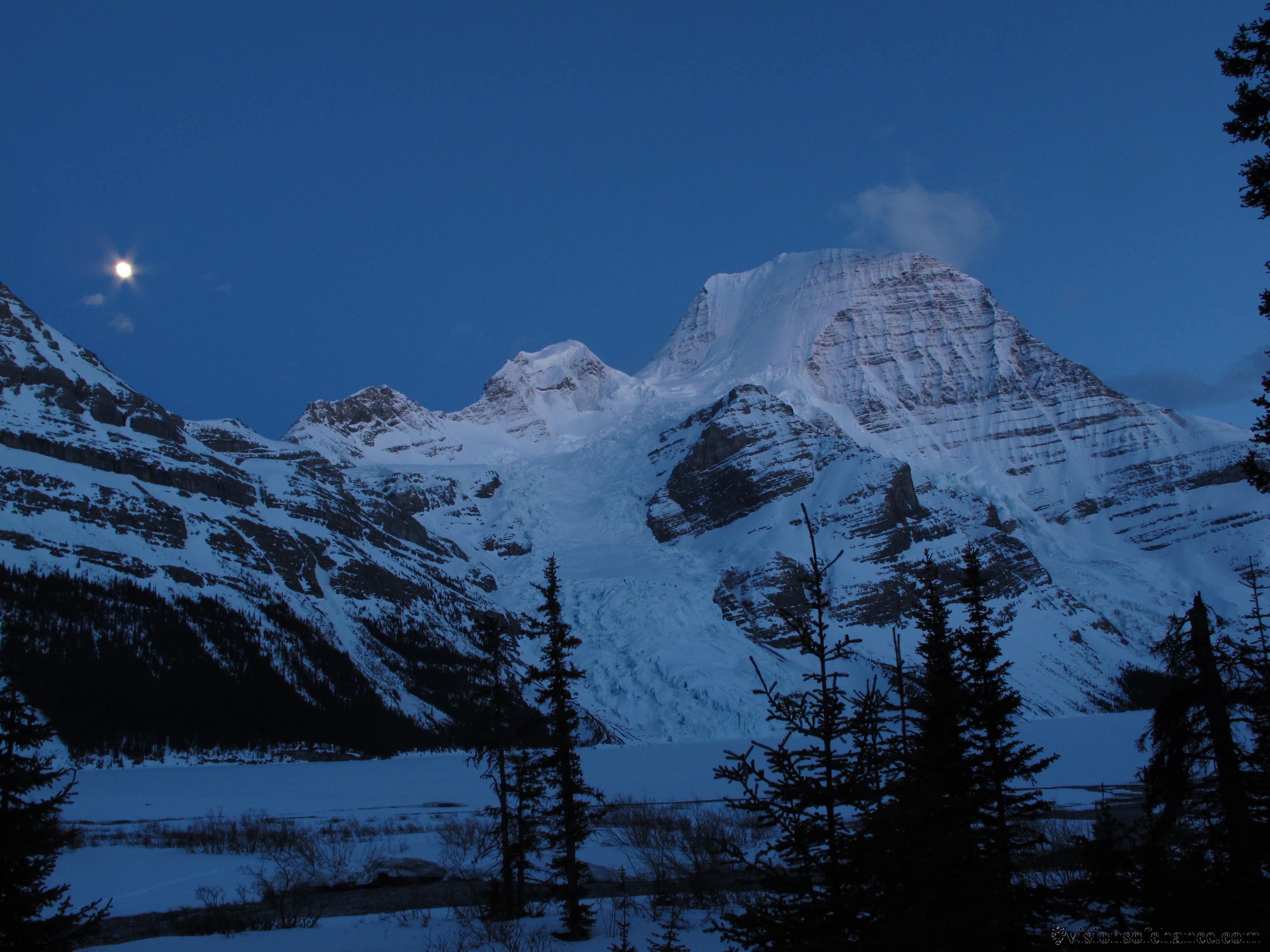 It felt fantastic to get the “pigs” off our backs on the shelter’s front deck, and the rest of the evening was spent taking in the jaw-dropping views of Robson in the evening light. Capped in a bit of cloud that eventually dissipated, finally giving us a look at a very inspirational line: the North Face. In those early day of mountaineering with Jeff, I was flipping through Sean Dougherty’s guidebook Selected Alpine Climbs of the Canadian Rockies, daydreaming about climbing the King of the range, Mt Robson, when I noticed the note in the description for the mountain’s N Face route. Skied in Sept 1995, by Troy Jungen and Ptor Spricenieks! Whoa, I could not believe it! These guys must be crazy. I have since met both first descensionists, and it’s true, they ARE crazy. In a good way. But this unrepeated line can only be described as visionary. The two had just finished a stretch in the steep skiing Mecca of Chamonix, and despite a well-funded attempt on the plum line of the Rockies by a movie crew with an imported athlete, these two canucks came home and sent the line of EVERYONE’S dreams. The debate about whether what we could see from the hut was snow or ice went on until the face was illuminated by the rising moon, and we retired with alarms set for early. We will see what Mt Resplendent, Robson’s 11,181 foot neighbour, is looking like tomorrow…