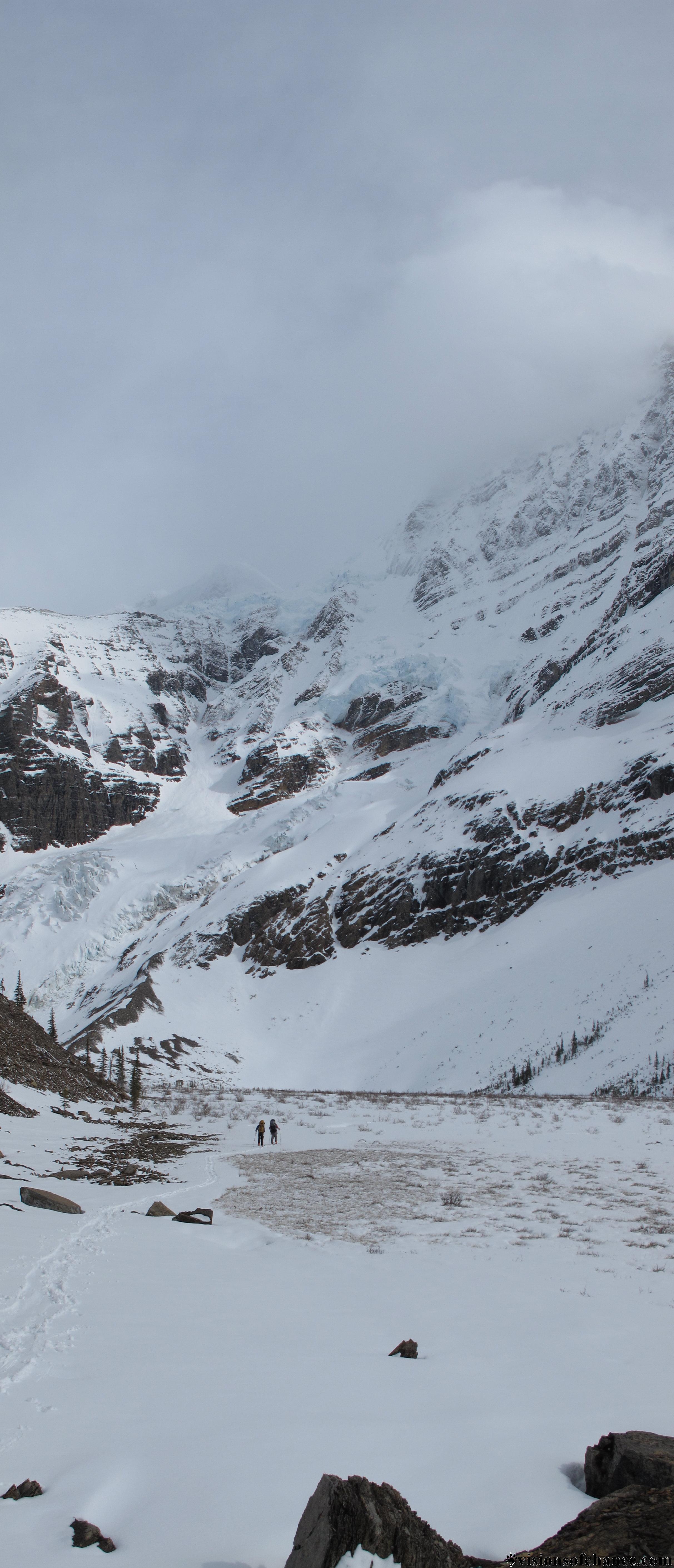 This went all right, though the heavy packs were taking their toll by the time we got our skis on. We finally rounded the corner to the beautiful splendour of Berg lake, with the awe-inspiring views of Mt Robson’s Emperor Face giving us the bit of juice needed to push on. This is where we started to think that crashing at the Hargreaves shelter at the far end of the lake was a good idea. Unfortunate that we are carrying these tents…