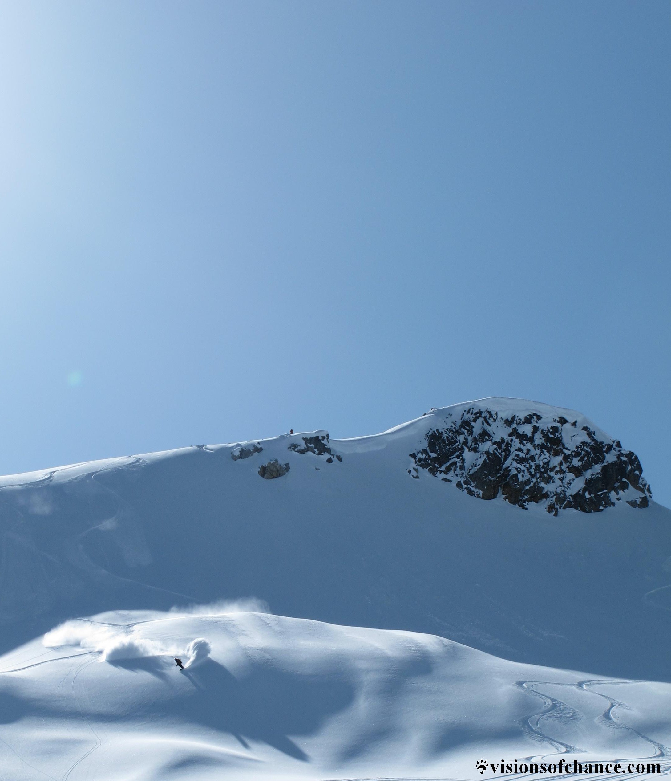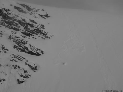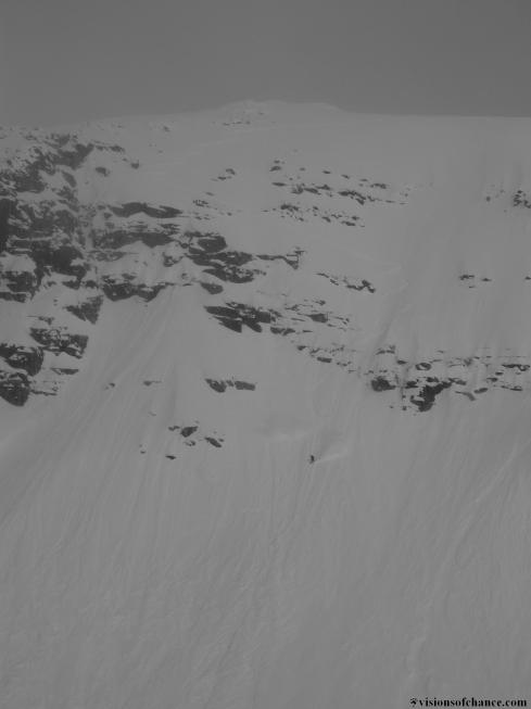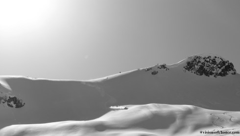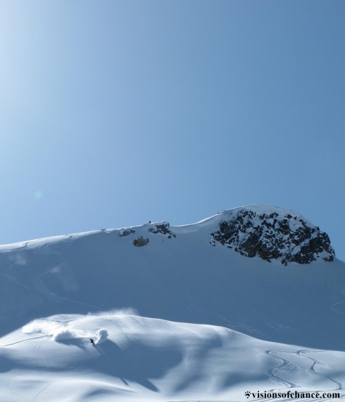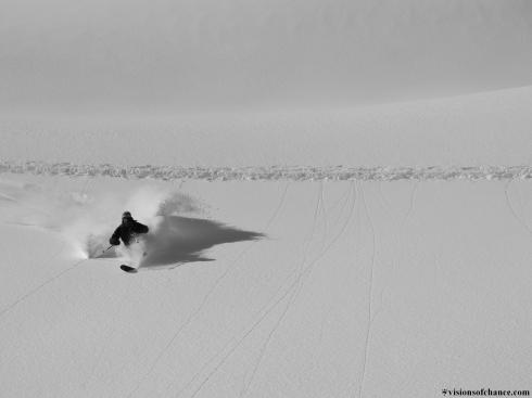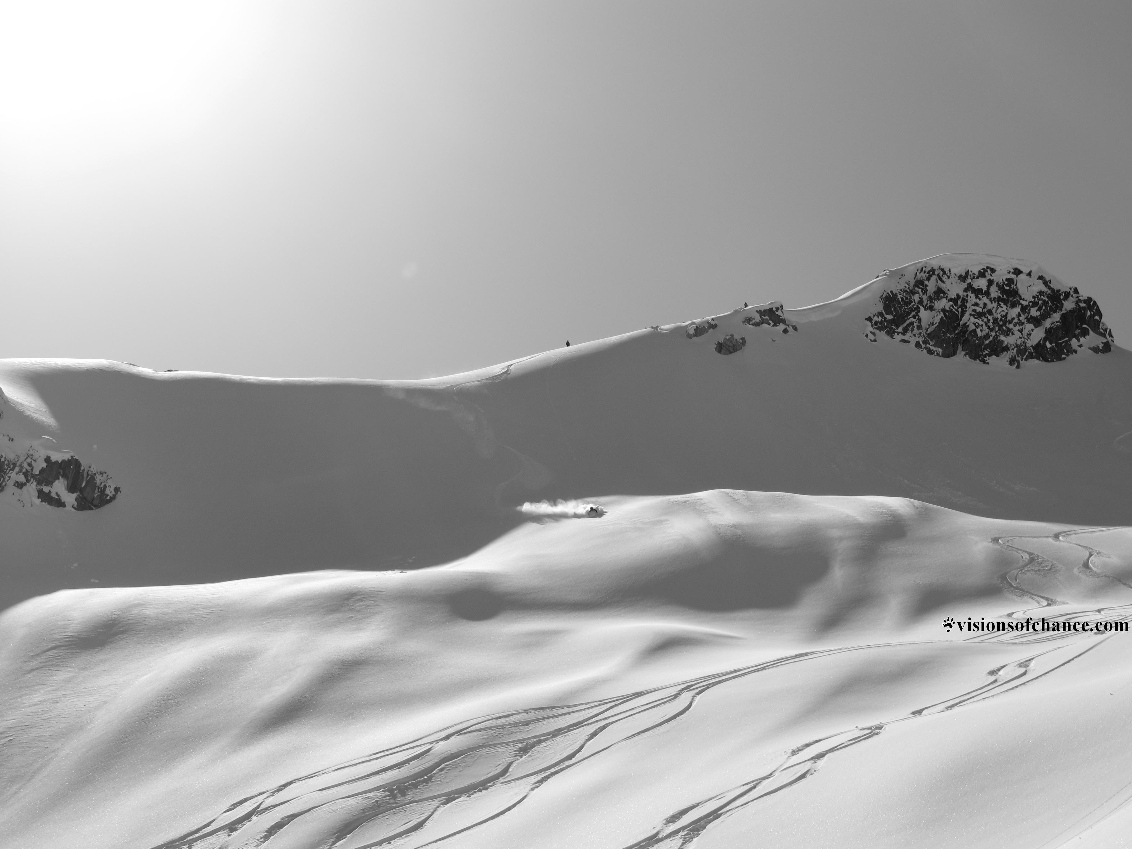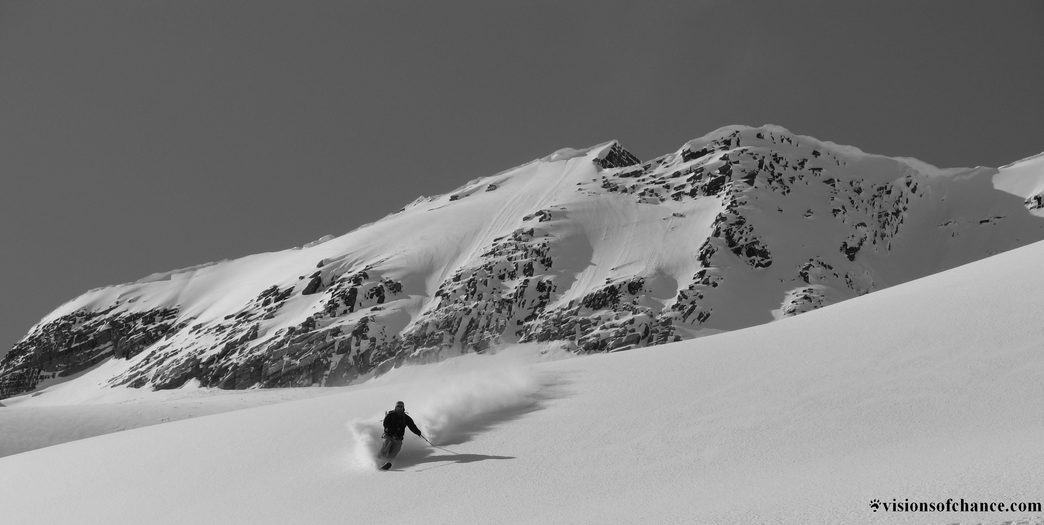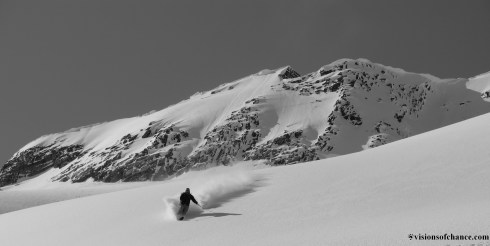 The time of year had come to hunt for the goods on the shady sides of the mountains. The crew chatted about options during the commute to the Pass, in English and French. Julie, Renaud and Conor are bilingual, and Mark, Rob and myself fall into the unilingual category. We settled on the Asulkan drainage and it’s plethora of NE facing options, plus we could take advantage of an uptrack set the previous day on the Dome glacier. In no time at all we were standing on top of the run depicted above, and when we pulled up at the bottom with huge powder grins on our mugs and a whole day of perfect settled spring pow ahead, the plot thickened. Here’s a colour pic of Rob M rippin’ the @&$* outta tha Dome.