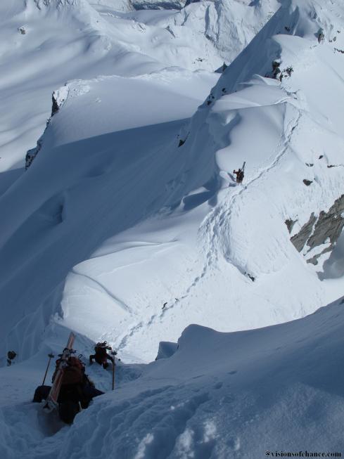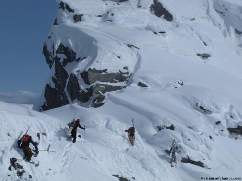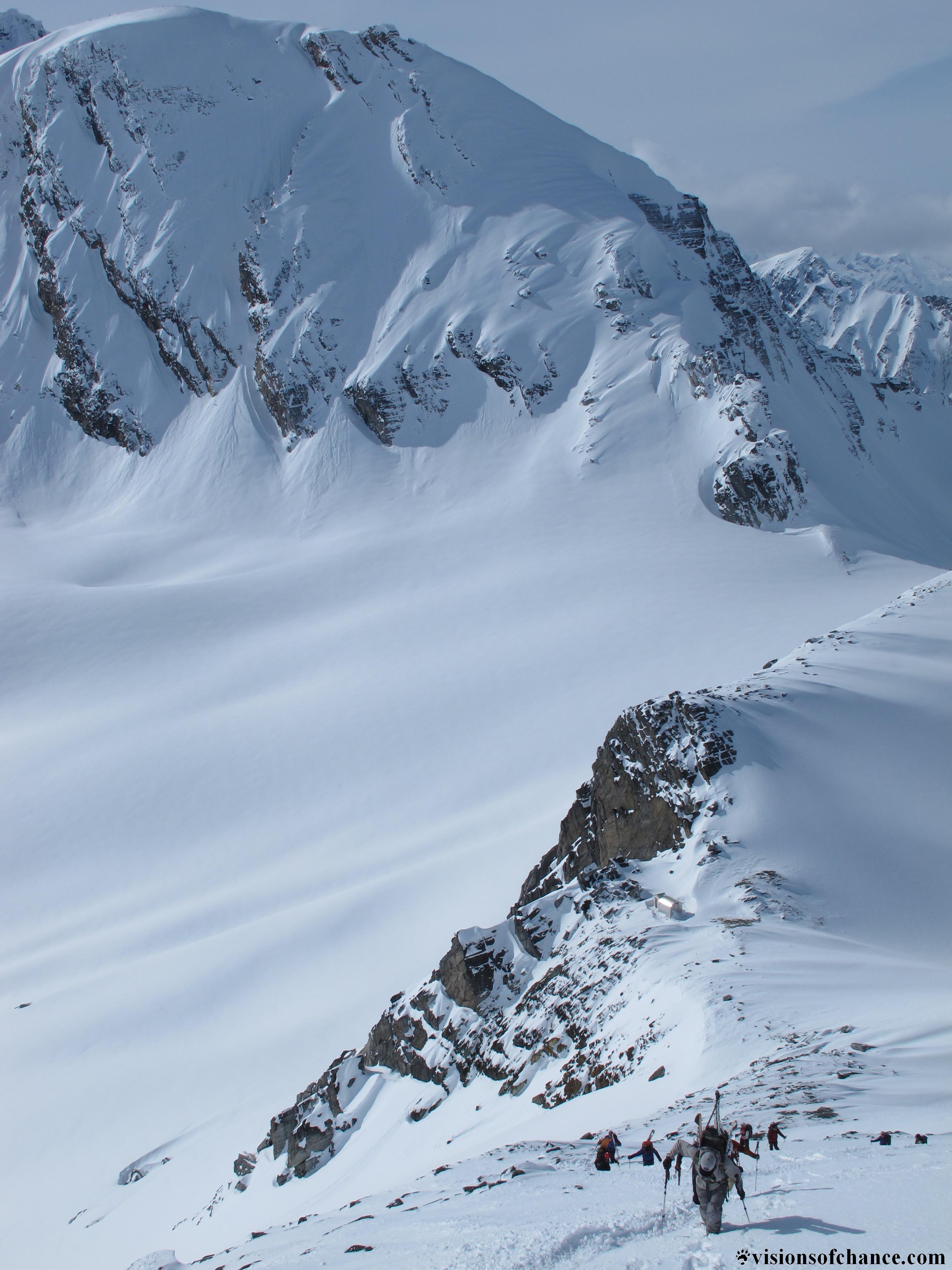 Our team of three skiers and three snowboarders cycled the uptrack again and snuck over the ridge to the Sapphire Glacier. The mountains were alive with people on such a gorgeous day. We were aiming to traverse the three peaks of Mount Jupiter, and a party had just set the bootpack to the first, Castor. Perfect.