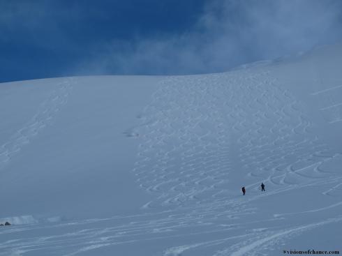 By the time we made it to the final pitch below the summit, the two tracks on the face had multiplied into many, and no wonder. I don’t know the boarder in the pic above, but I am sure he is having fun! The 20-odd folks that skied Young’s that day kept their tracks nice and tidy, so lots of room for us.