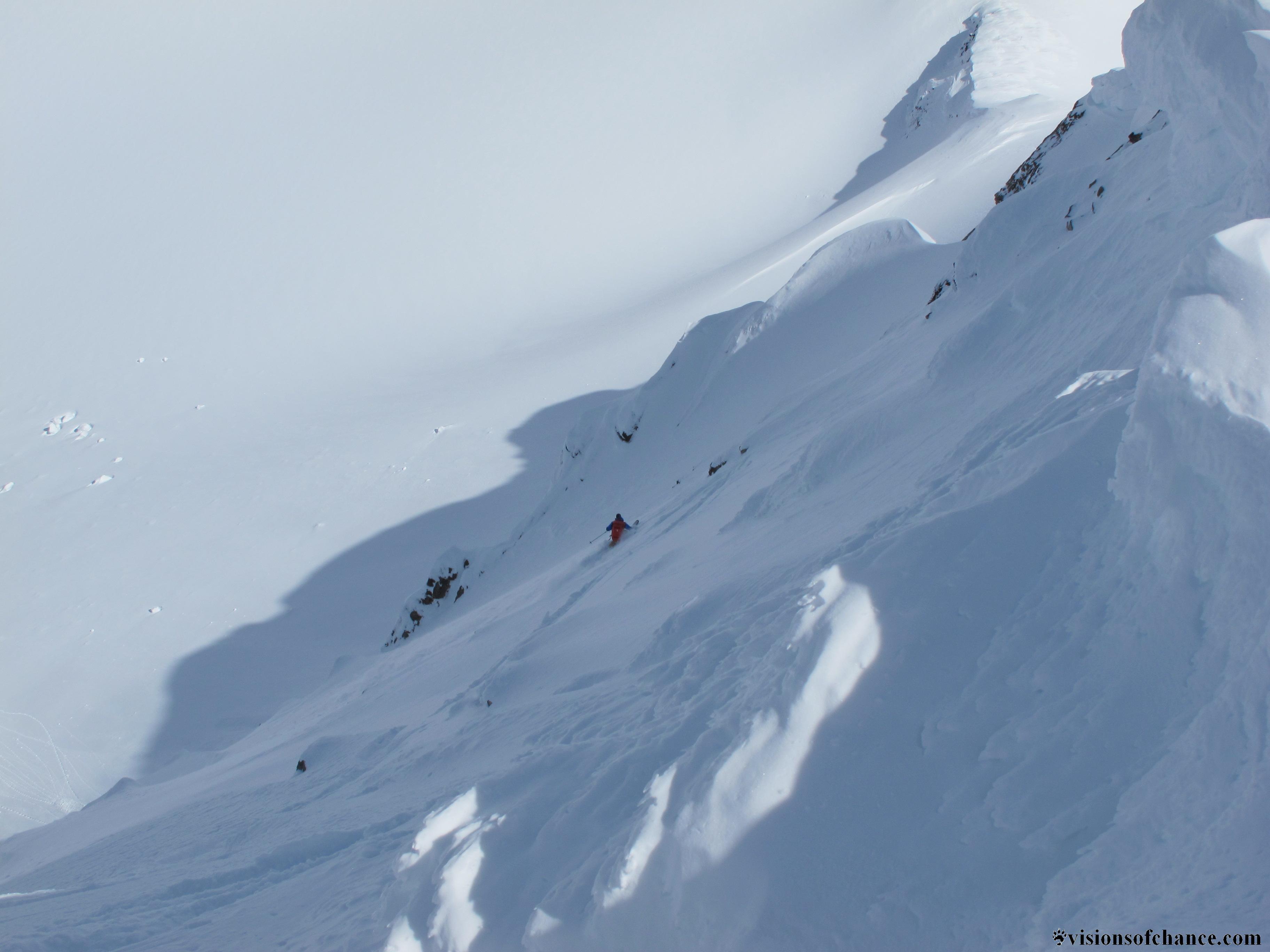 The snow turned out to be quite faceted on the face, excellent skiing,and steep enough to get the heart pounding. We pulled up on the bench below and re-skinned with our eye on a perfect NW facing run off Boulder 2, the snow was looking well preserved. A short time later we were standing on the second summit of the day, looking down our 6500′ run back to the truck. I love the Columbia’s. The honors are mine this time, and the turns off the summit are dream-like. See the video posted a while back, and here a shot of the top part of the run.