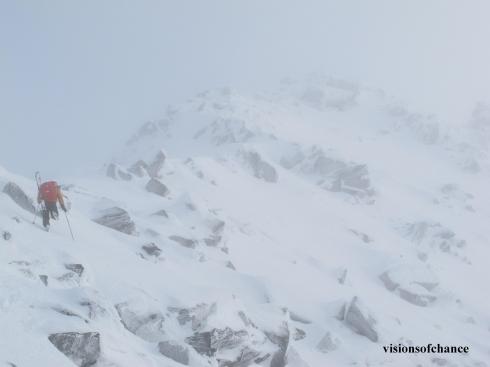 Crossing the NW glacier and scrambling up the NW ridge was quite surreal in the low light, almost dream-like. With our descent still uncertain as we gathered for the summit high fives, a quick look at the watch made our call: the sweet SW ramp that leads down to the Hermit Permit area. Most direct line back to the highway it is! We worked our way down thru the salt-and-pepper rocks at the top, and descended into the whiteout…